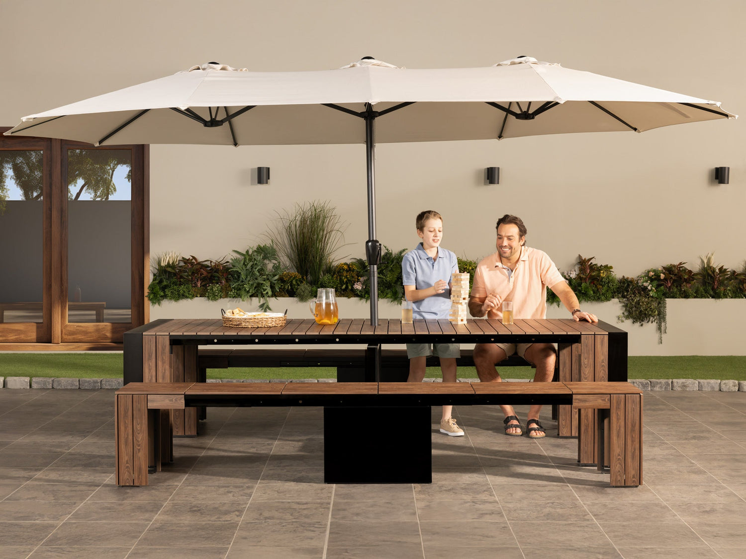 - Extendable outdoor dining table, seating up to 12 guests