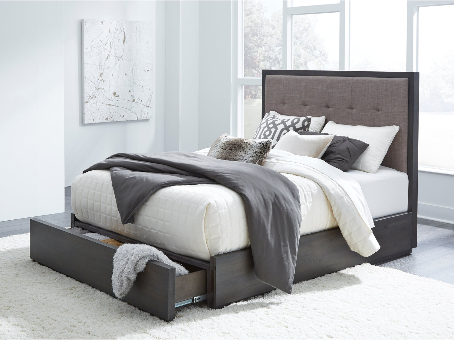 The sleekly tailored Oxford collection makes a striking first impression with bold proportions, crisp, modern lines and a weathered finish. Smartly accented with top-mounted nickel plated pulls, concealed footboard storage, and a floating plinth base. Available in Basalt Grey.