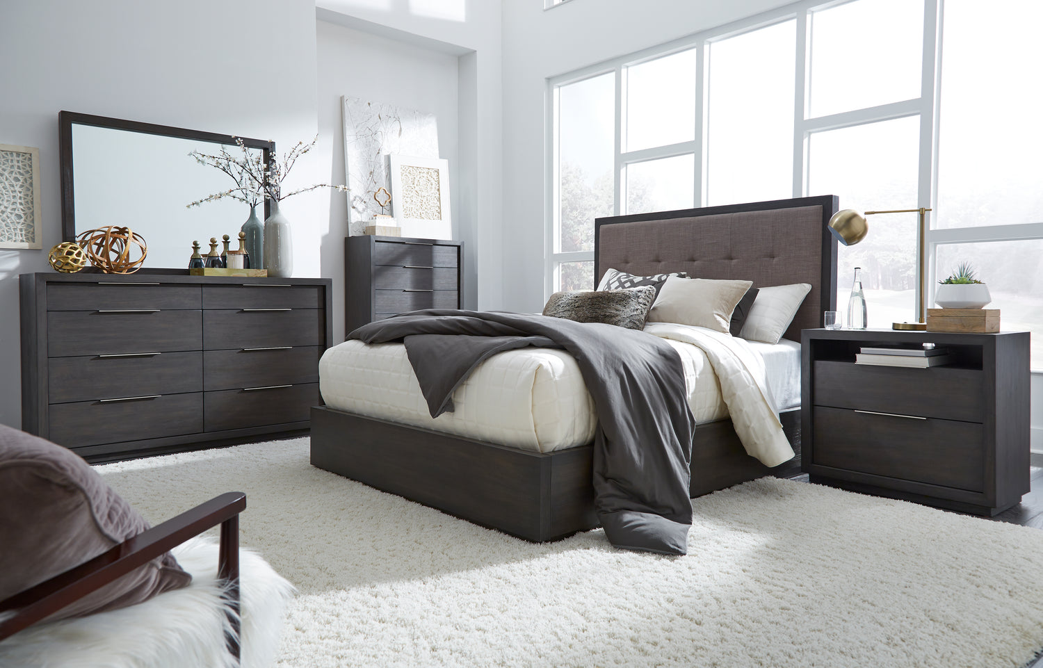 The sleekly tailored Oxford collection makes a striking first impression with bold proportions, crisp, modern lines and a weathered finish. Smartly accented with top-mounted nickel plated pulls, concealed footboard storage, and a floating plinth base. Available in Basalt Grey.