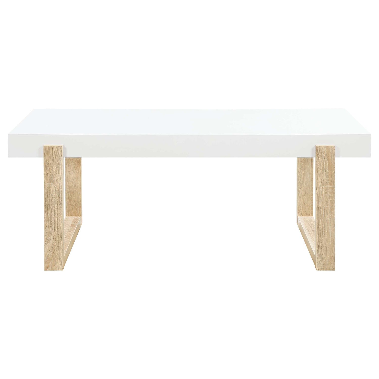 A spacious white high gloss tabletop offers a minimal look and feel to this modern coffee table. Designed with cheerful bright hues throughout, this coffee table also features a thick square tabletop that nestles inside a sled base with dual U-shape legs. The base's light natural hue further pushes the whimsical nature of this coffee table and offers a charming casual look with its variegated wood grain pattern. Situate this coffee table in front of a sofa for a place to keep magazines, a glass of wine and more. Or allow it to take center stage with a sectional seating arrangement.