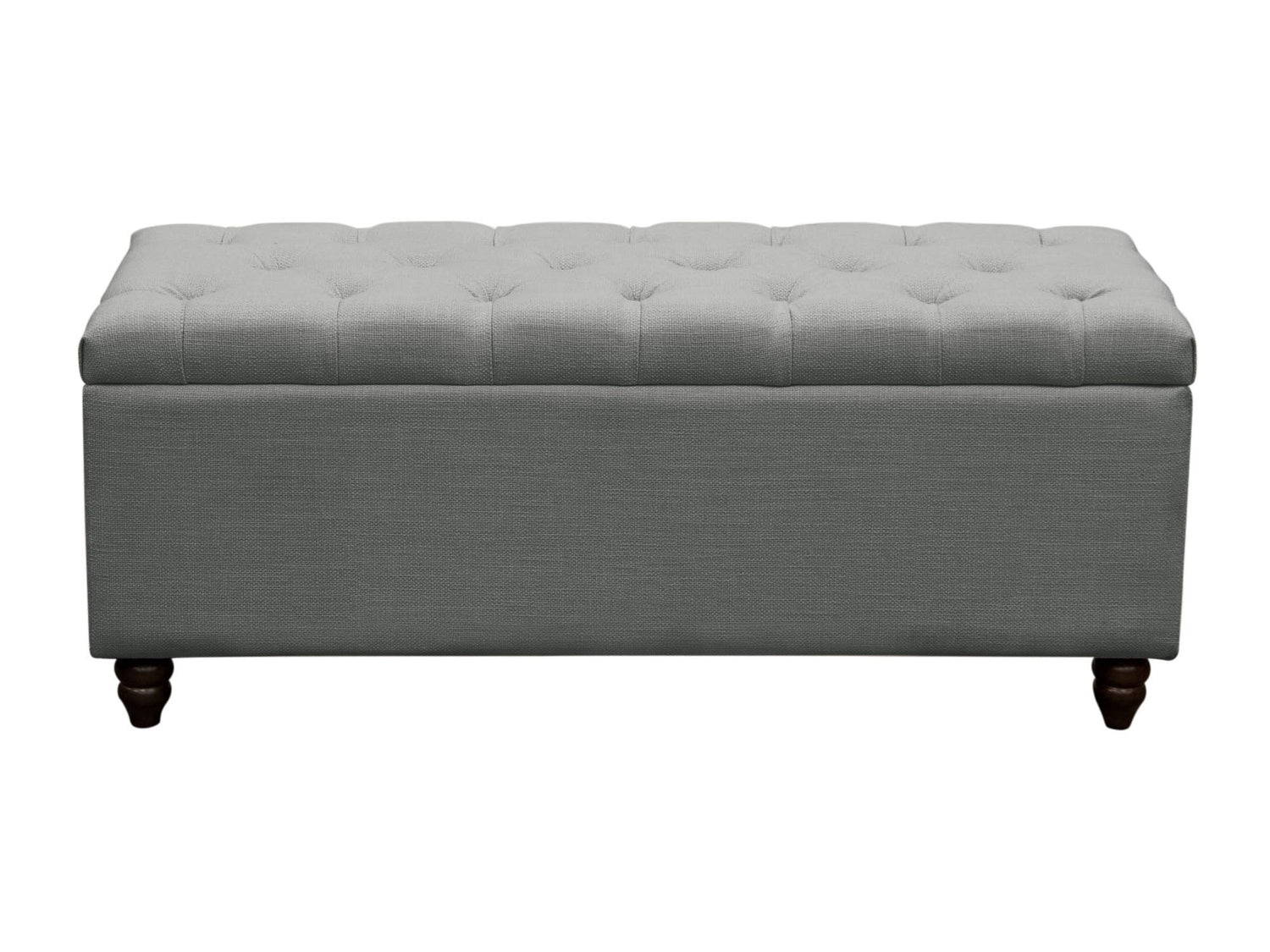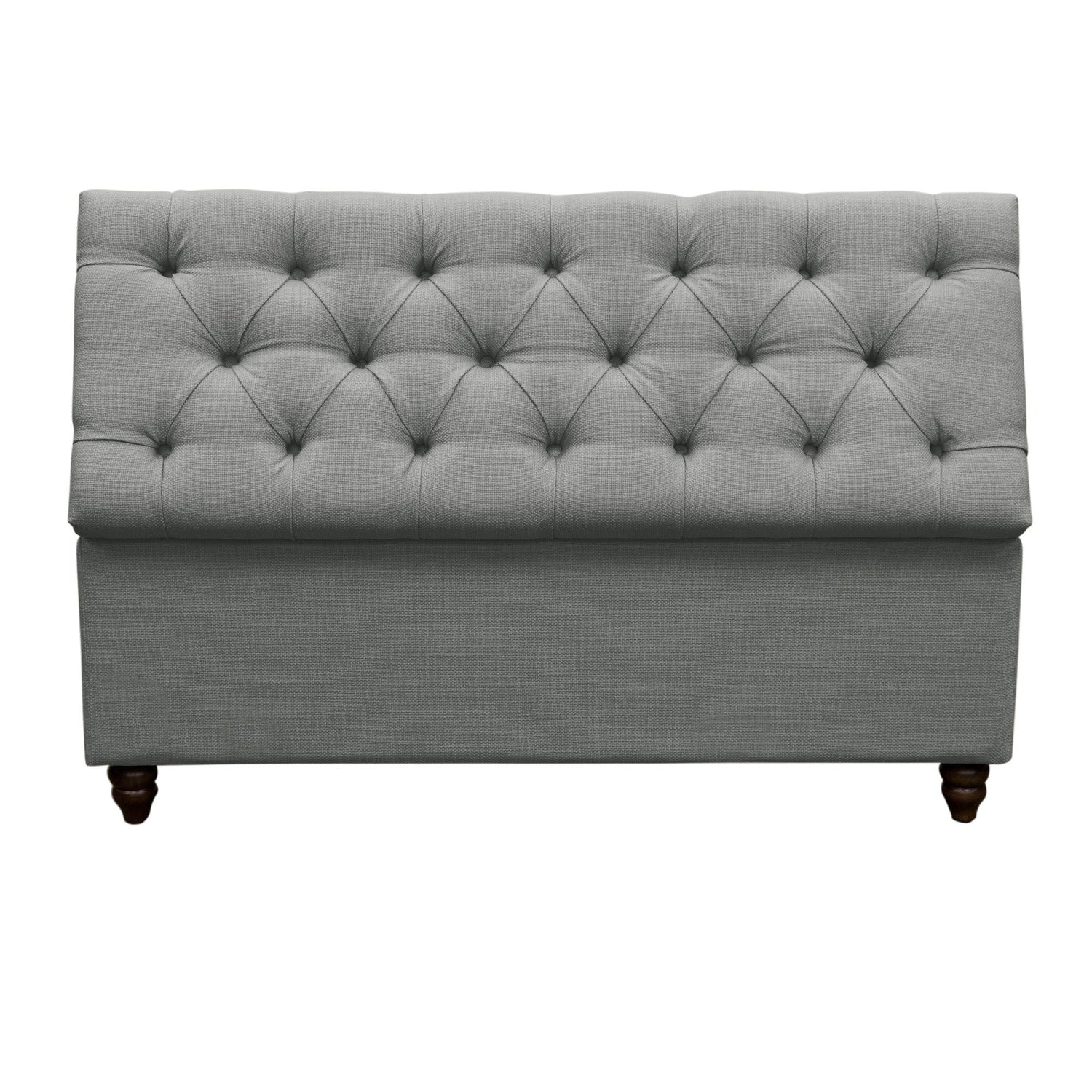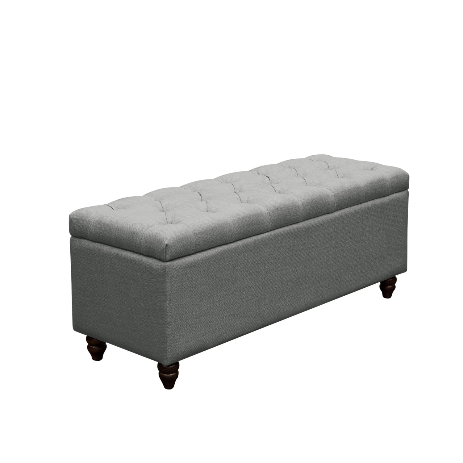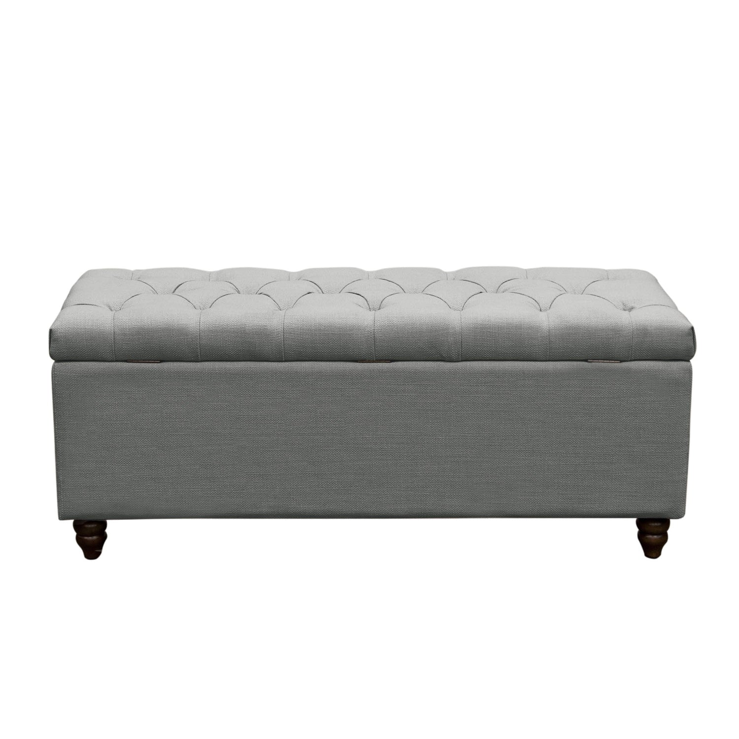 - Made with a sturdy hardwood construction, covered and tufted in a Grey Linen fabric with dual tension hinge on the lift.
