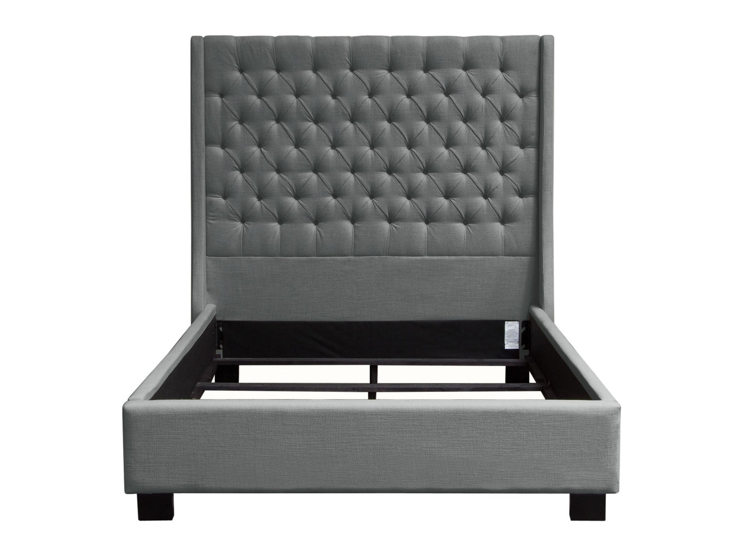 - With its tufted headboard, vintage wing accents and wood feet finished in a rich medium walnut finish providing the backdrop for the Grey Linen finish .