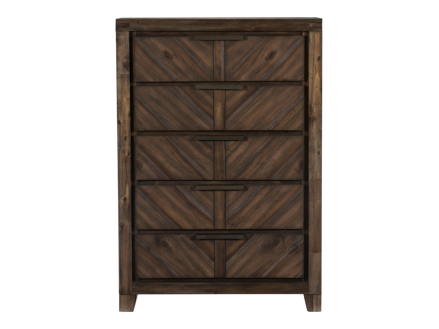 Inspired by the aesthetic of modern-rustic design, the Parnell Collection utilized bold enhancement to create the perfect addition to your bedroom. V-matched planks draw immediate attention to their visually stunning shape and distressed espresso finish, over acacia veneers, that graces the collection. Mounted at the top of each chest drawer are antiqued finished pull hardware which enhance the rustic vision. Bold, yet understated, framing defines the collection’s modern profile.