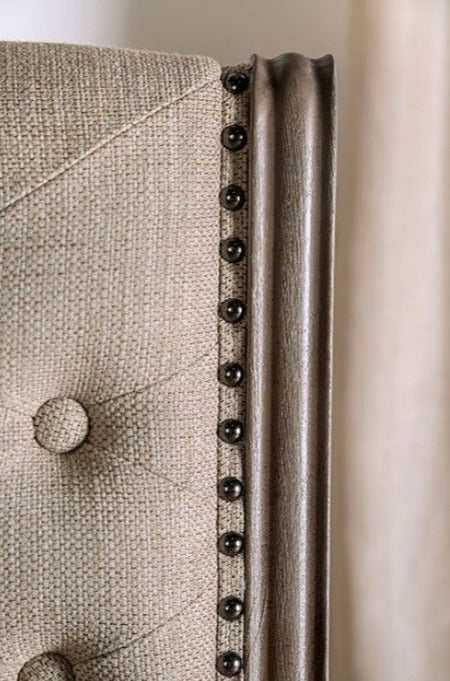 Rustic glam is a delicate balance between opposites. The button tufted backing and tight nailhead trim work in conjunction with the beautiful wood grain to give off this stunning visual.