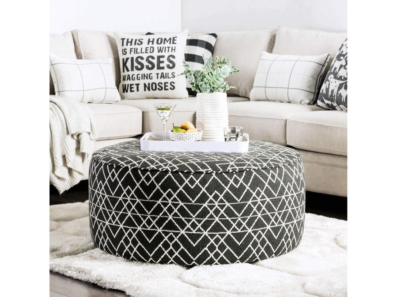 This tall round ottoman enthralls with its geometric pattern. The ivory lives dance across the black upholstering and helps add a sense of height to the piece. The welting trim stands out just enough to add another visual element to the piece.