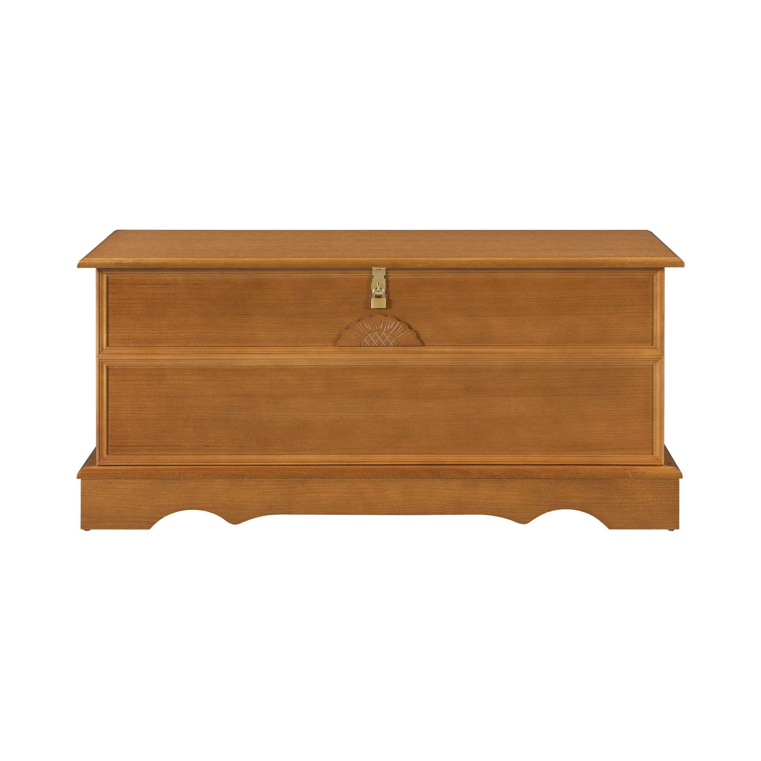 A wood storage chest brings character and practicality to any room of the house. This solid wood chest is constructed to be durable and crafted to be simple and genteel. Sufficiently spacious for all your seasonal bed linens or family heirlooms. The locking lid keeps out prying eyes and fingers when hiding gifts and other secret surprises. Honey brown finish is gorgeous in a bright bedroom.