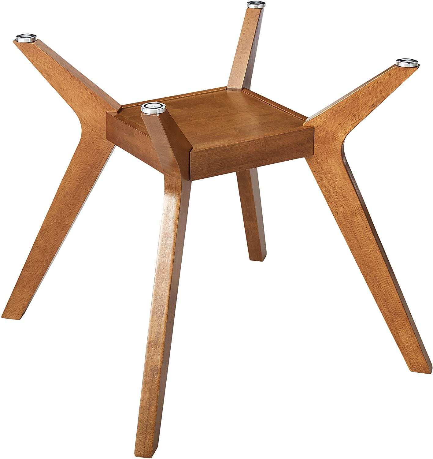 - Boomerang curved table legs meet around a square tray shelf in the center of the base