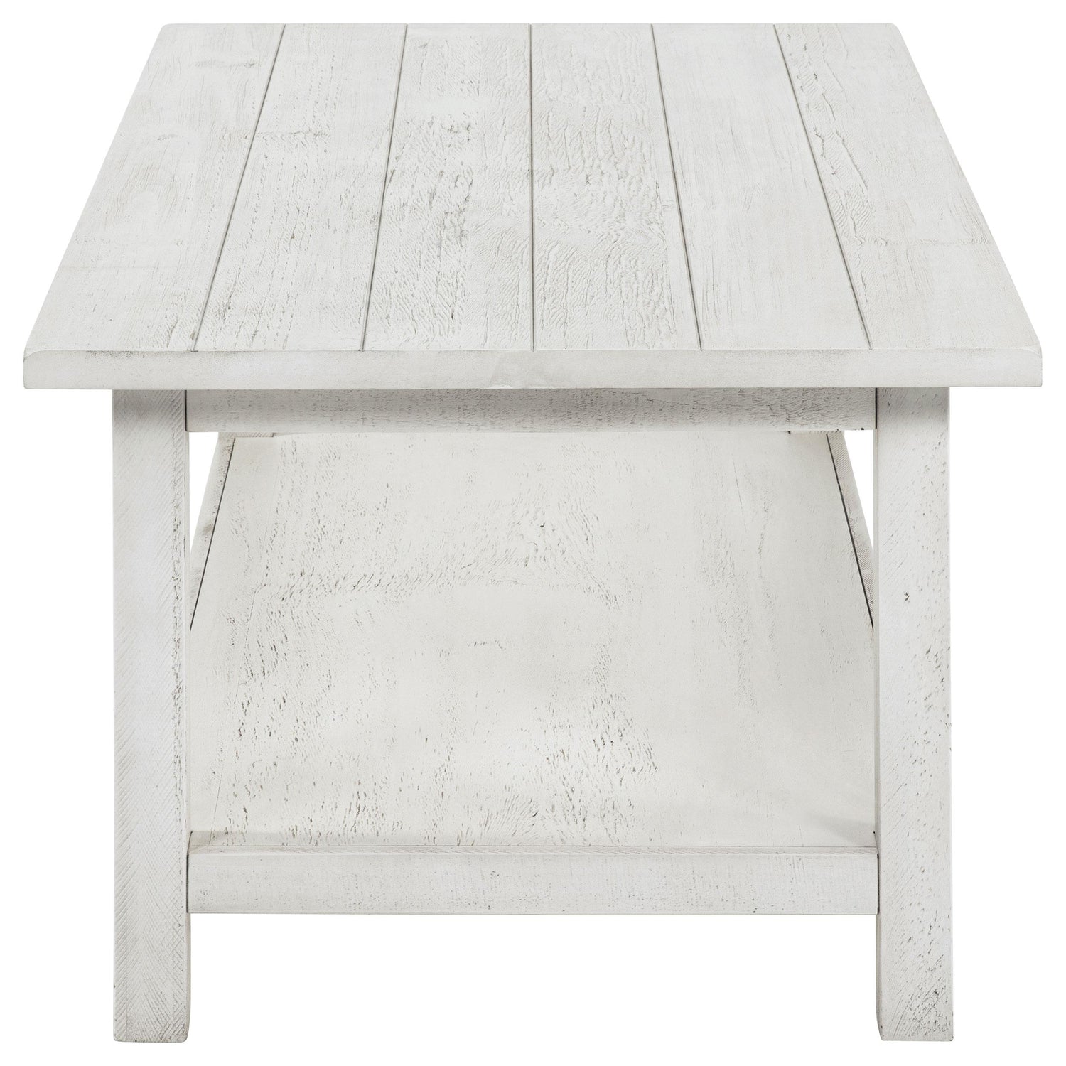 - Distressed white finish imparts a cozy, rustic flair to your décor scheme