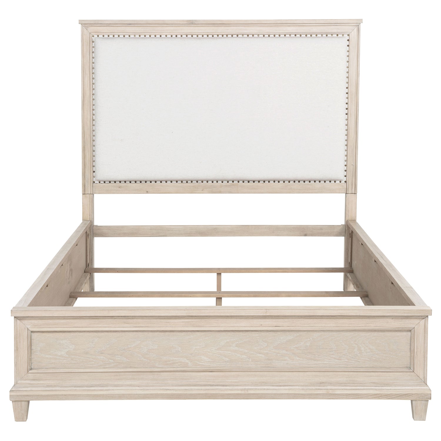 - Queen panel bed with cream upholstered headboard and tailored nailhead trim,