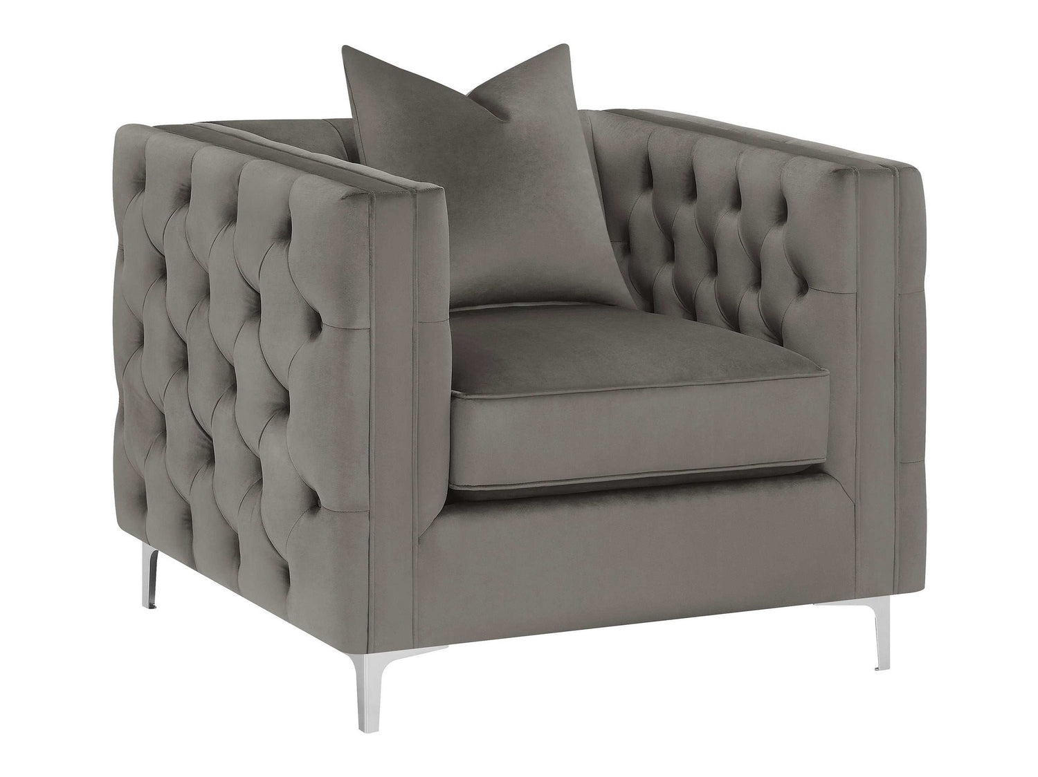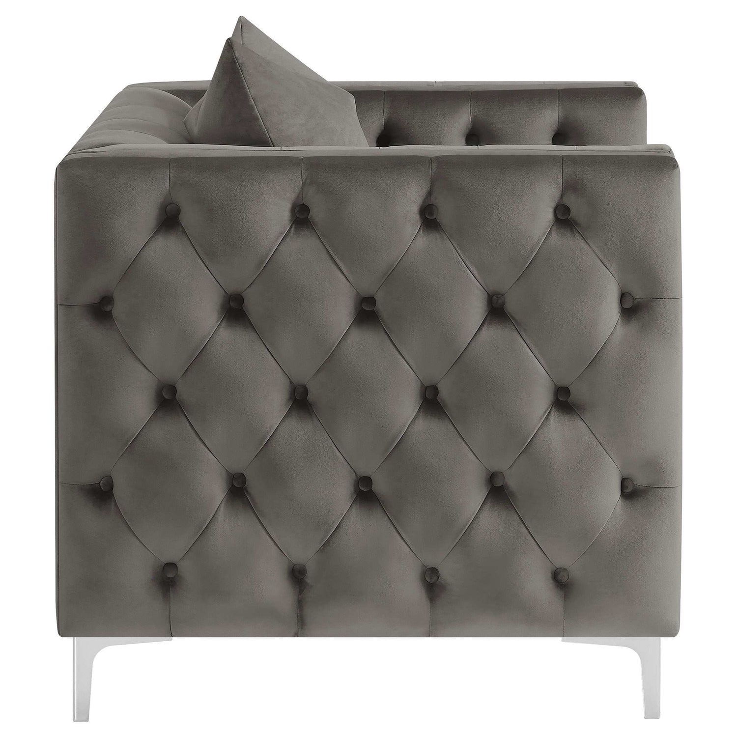 Transform reading nooks into a mid-century modern retreat with this modern, glam chair. Created with a tuxedo-inspired frame complete with wide track arms, this cozy chair embraces you as you sit back and relax. Upholstered in a soft urban bronze velvet, this lounge chair lends a dark neutral tone for a dramatic flair to your contemporary living room space. Classic button tufting accents the taught backrest and even the outside of the track arms, creating a hint of texture. The supportive metal bracket offers a sleek modern flair as a matching throw pillow offers extra lumbar support.