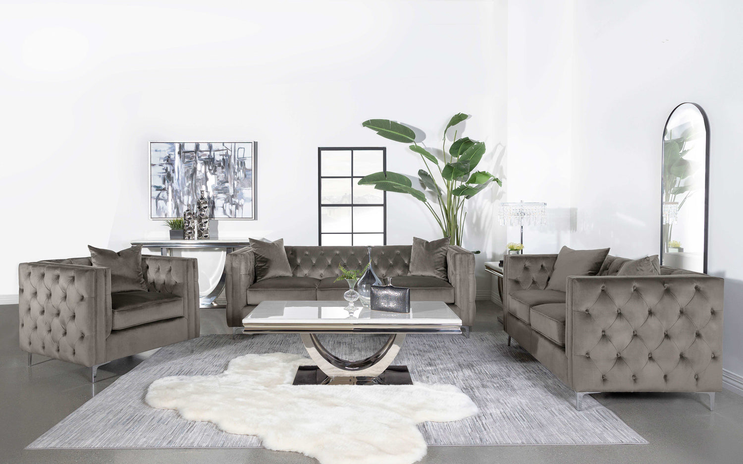 A soft urban bronze velvet offers a plush look and feel and neutral color tone