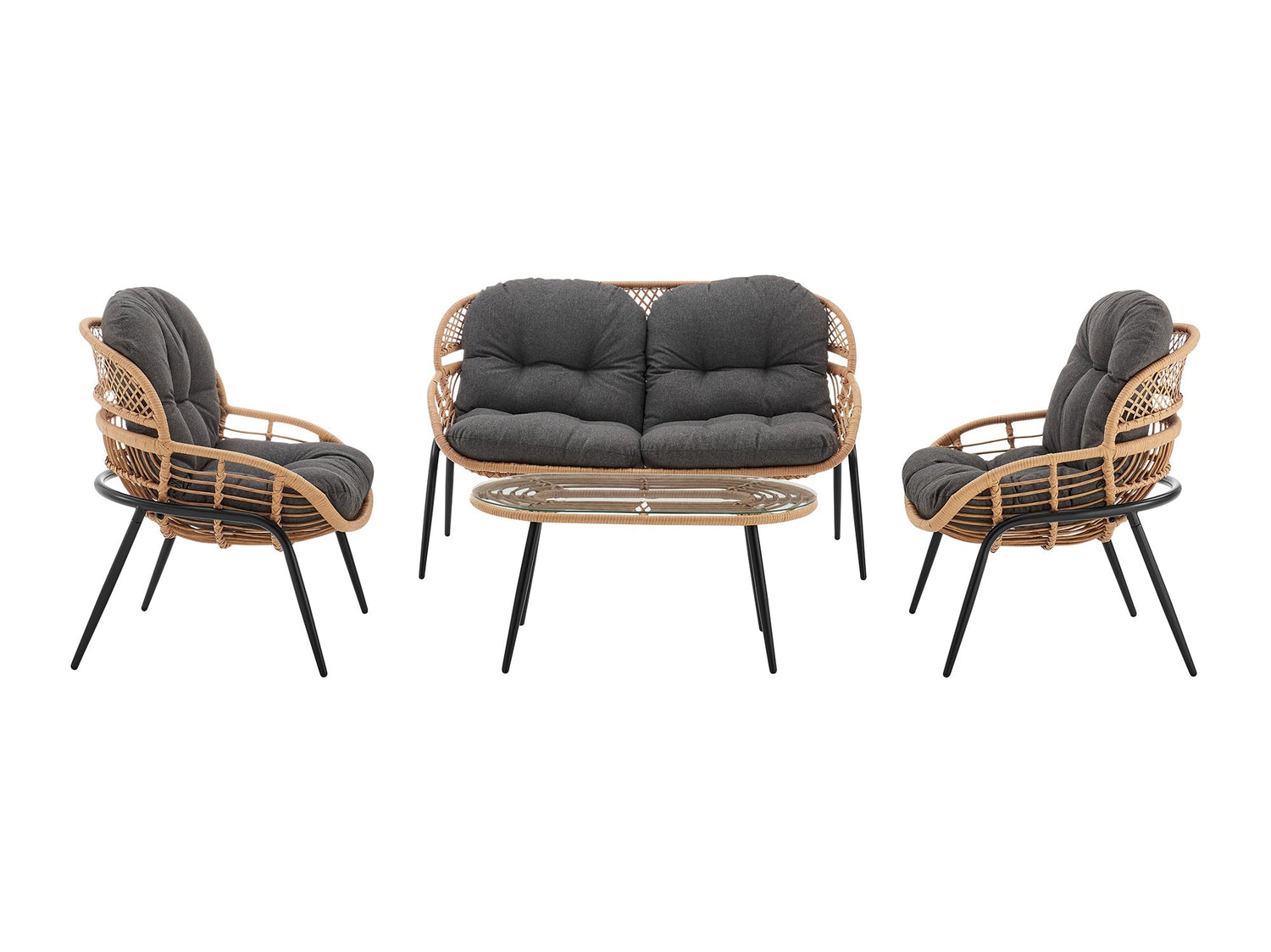 - Modern 4-Piece Outdoor Conversation Patio Set with 2 Armchairs, 1 Loveseat, and 1 Coffee Table.
