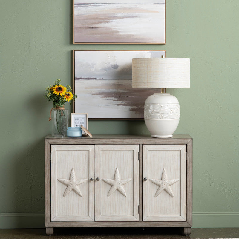 - Coastal-inspired design with a rounded ceramic body in cream and ivory