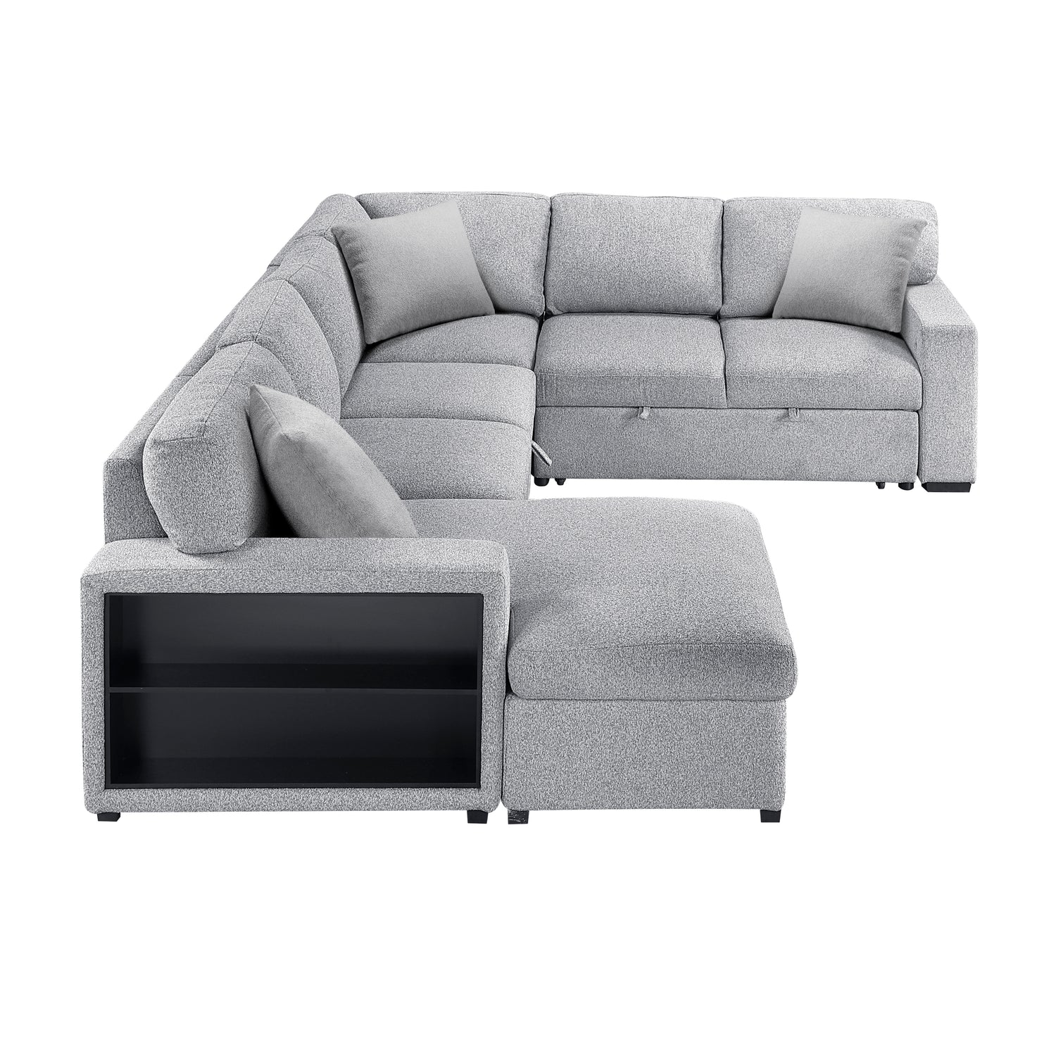 Upgrade your living space with this versatile contemporary sectional sofa, designed to offer maximum comfort, smart storage solutions, and modern convenience. Featuring a left-facing chaise lounge, a pull-out sleeper bed, and hidden storage compartments, this sectional is perfect for lounging, hosting guests, or optimizing small spaces. The built-in open shelving on both armrests provides easy access to books, decor, or everyday essentials, while the integrated USB charging ports keep your devices powered without the mess of extra cords. Wrapped in soft, durable fabric upholstery, this multi-functional sectional is a perfect addition to any living room, entertainment space, or guest area, offering a seamless blend of style, practicality, and modern elegance.
