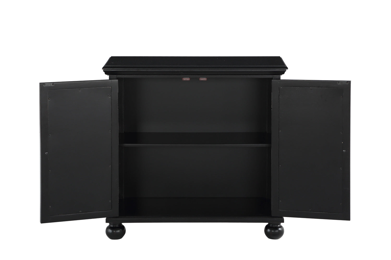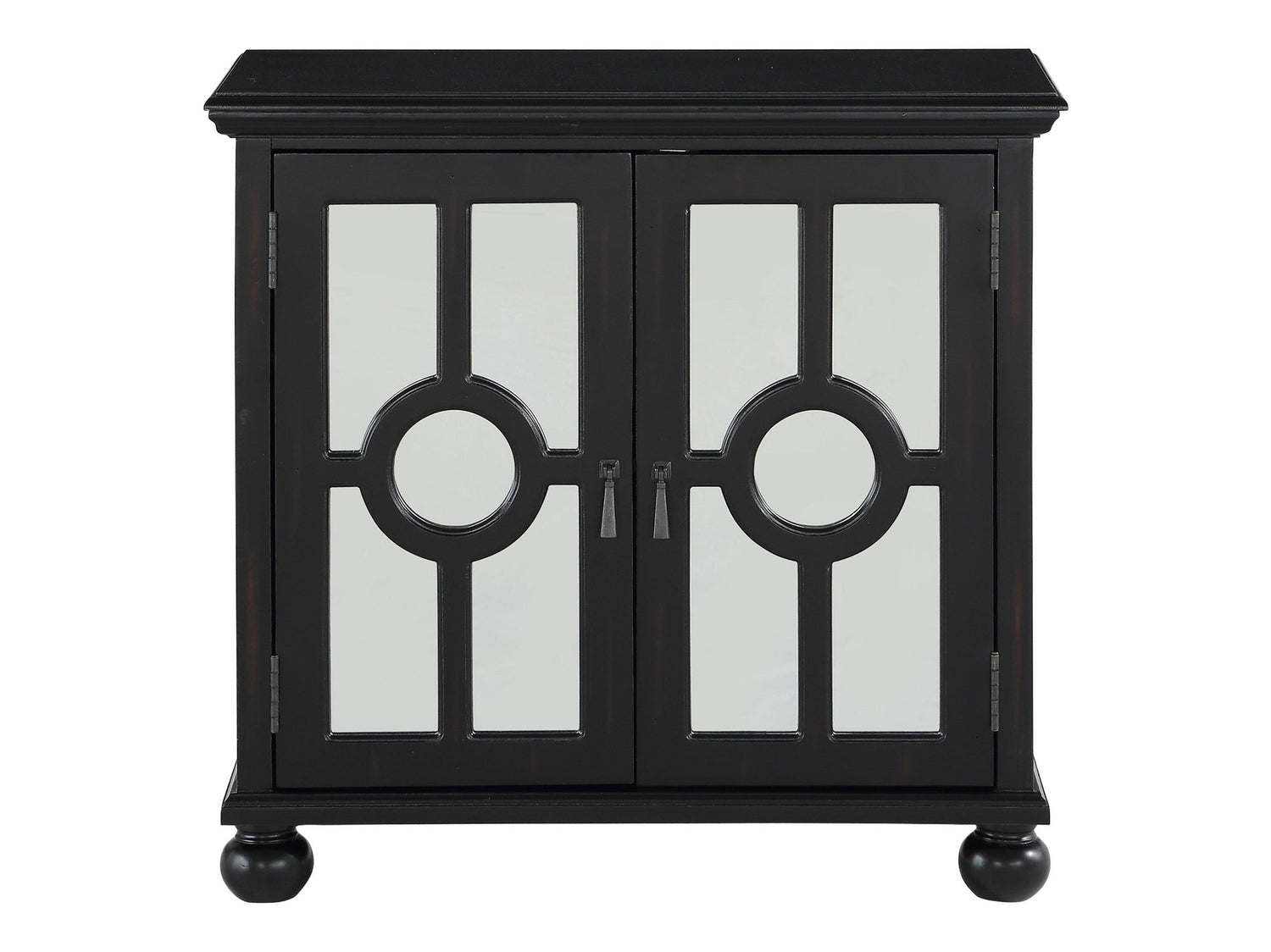 The Poppy Collection provides classic accent to your home’s décor while meeting your storage needs. The modern traditional design of the cabinet features behind door shelving, turned support feet, black finish, circular themed decorative mixed-media glass and wood doors, and antiqued brass hardware. Also available in aqua and gray finish.
