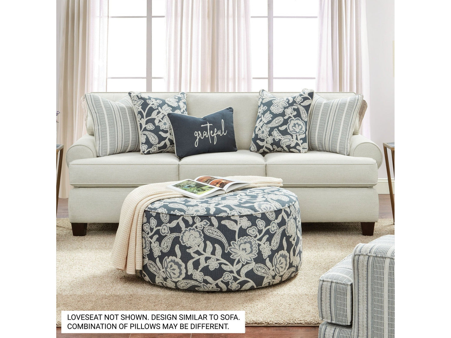 Conceived in part to be cost-efficient, this set enjoys a smaller scale that is elevated by grand styles. The ivory-colored sofa serves as the centerpiece; english-style rounded low-profile arms are accented by welt-cord trim while the tapered solid wood feet are darkly stained. Matched with a nearly identical petite-statured loveseat, the pair shares pillows featuring patterns that correspond directly to those of the chairs and ottoman.
