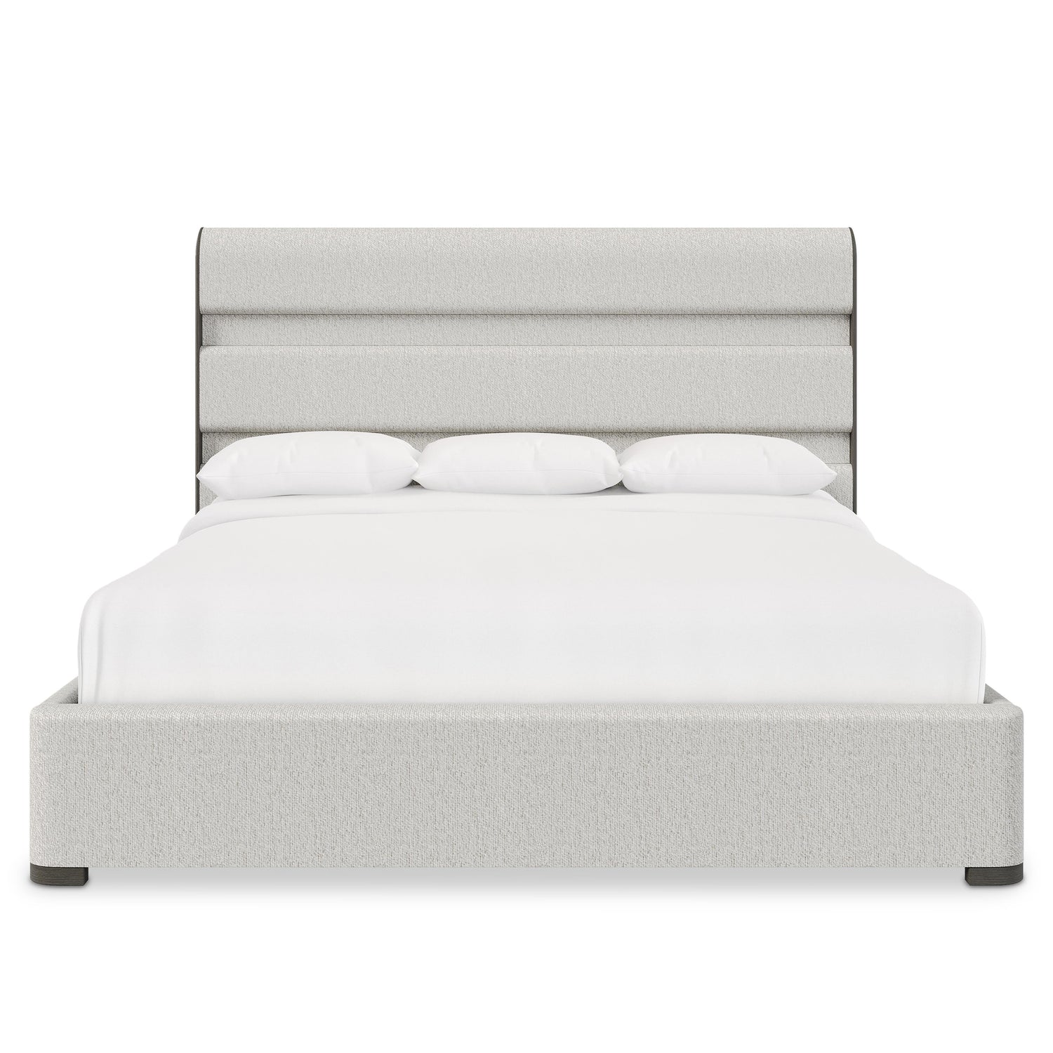 - Headboard has alternating upholstered and flat fabric panels in fabric B104 and wood ends and feet in Porcini finish