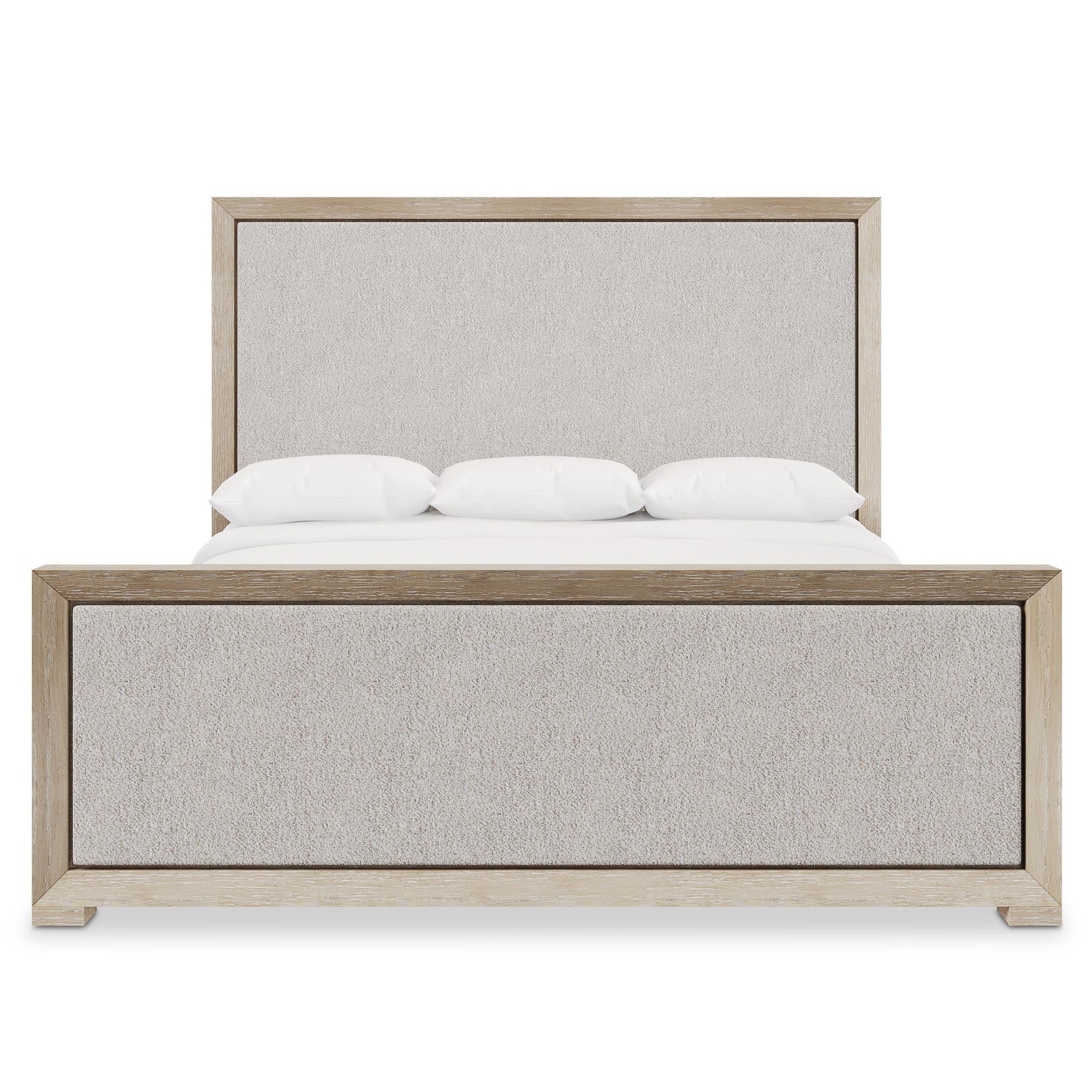 - Panel headboard and footboard with wood frame in Tawny finish and inset upholstery panel in fabric B102