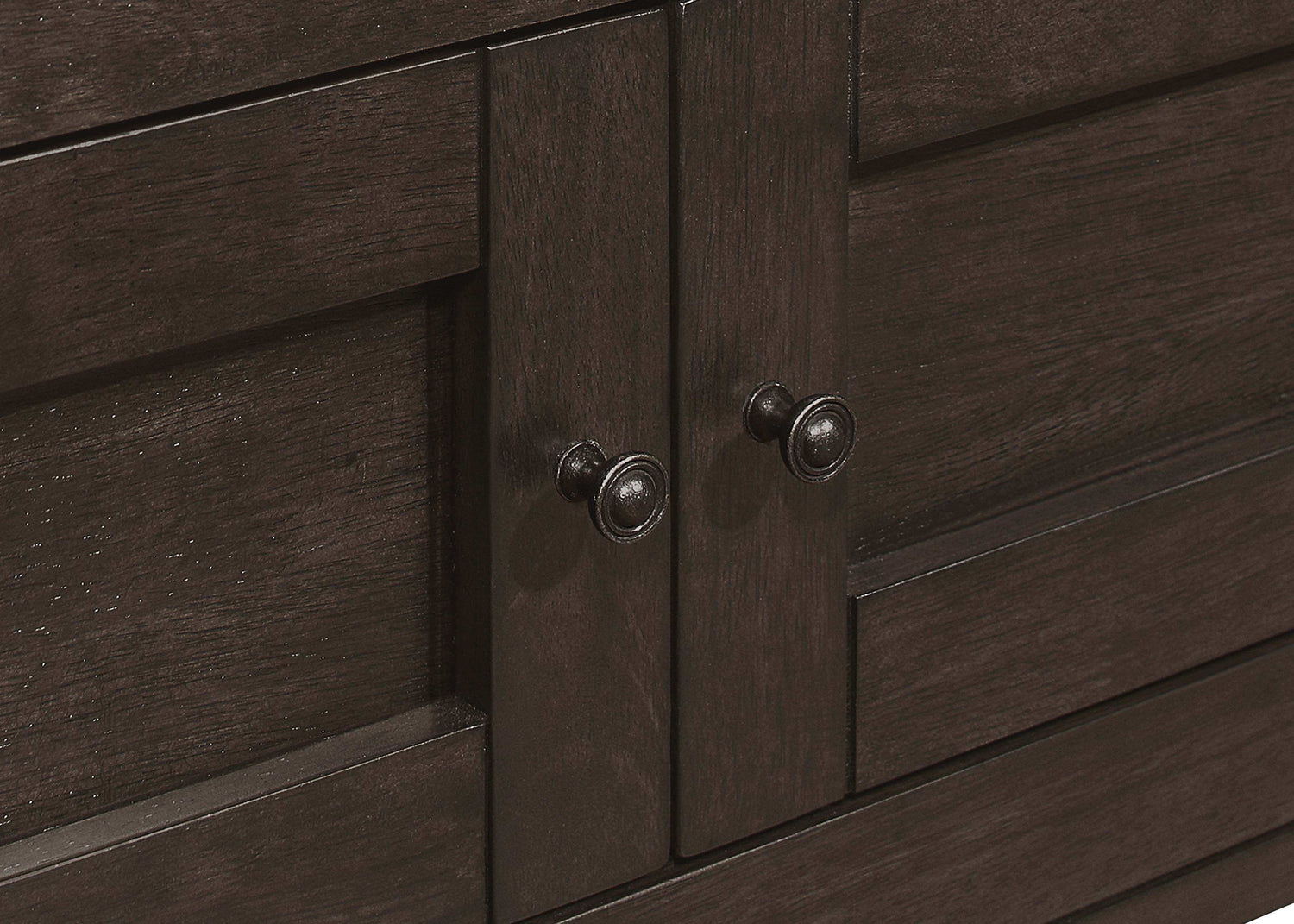 Create a more casual dining experience for family and guests with this elegant, rectangular counter height table. A rich, cappuccino finish brings a warm brown hue for a traditional touch. Designed with a large storage base, it also offers plenty of space below to keep your dining essentials. Four cabinet doors adorned with shiny metal knobs open to reveal a roomy interior, while an open bottom shelf presents a space to display cookbooks. Invite extra guests to dinner, extending the butterfly leaf.