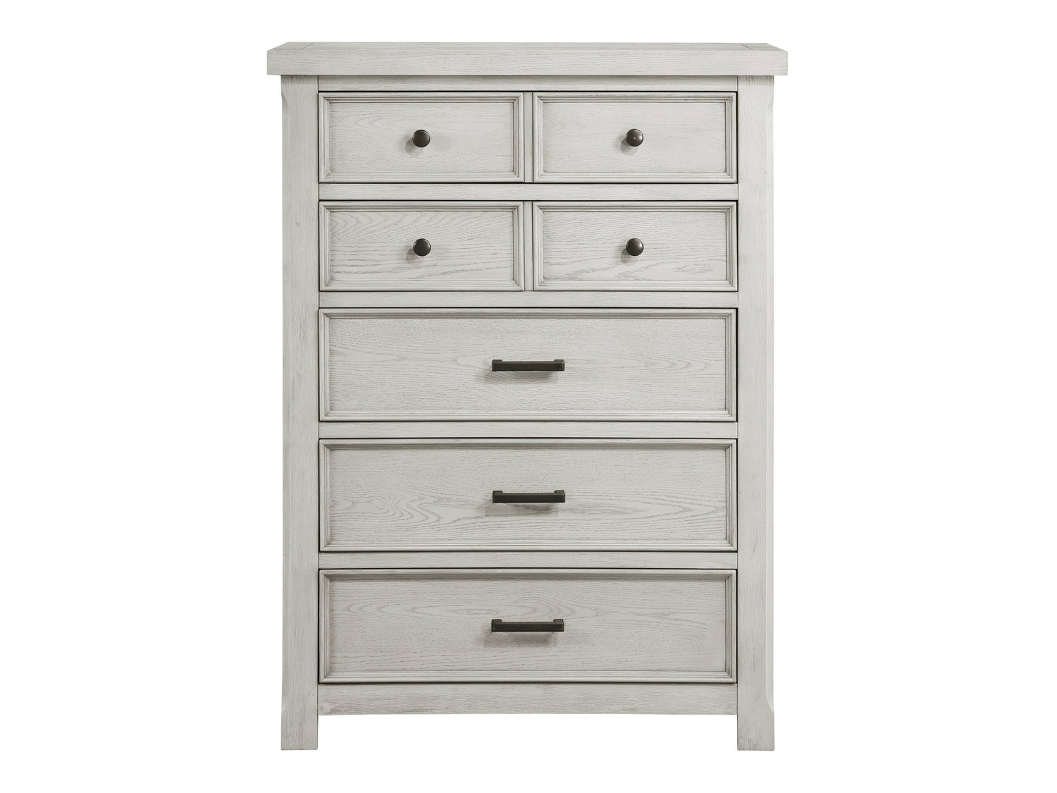 The Providence Collection’s lines and versatile finish create a classic addition for your bedroom. Oak veneer is finished in light gray, serving as a neutral canvas for your personal decorative preferences. The antique black tone metal knob and bar hardware provide complementing contrast to the light finish of the chest.