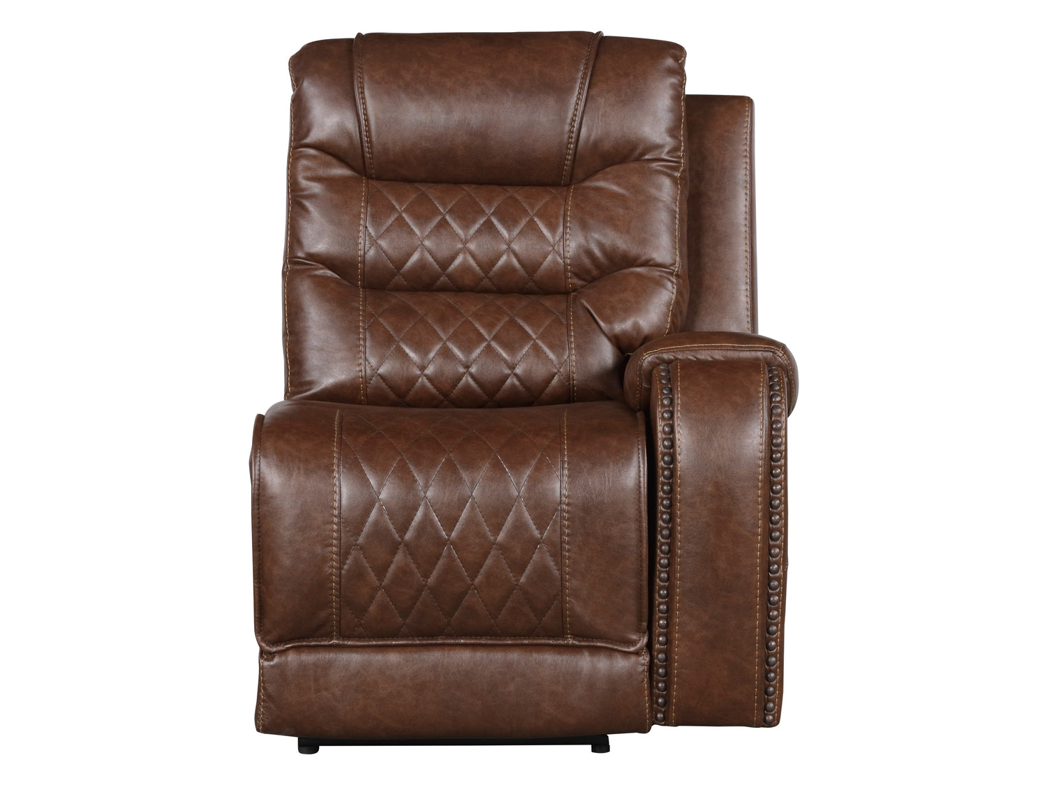 The Putnam Collection will serve as a functional, stylish, and comfortable seating group for your living room. Flanking the center corner unit are the left-side and right-side chair end-units, featuring power reclining mechanisms and USB port, allowing for perfect placement within your available space and configurable to your individual needs. The console features cupholders and power receptacles. Expanding the profile of the sofa are the power recline armless chair and manual recline armless chair. The Putnam Collection is offered in brown polished microfiber fabric with diamond pattern stitching with nailhead-adorned arms for classic decorative effect.