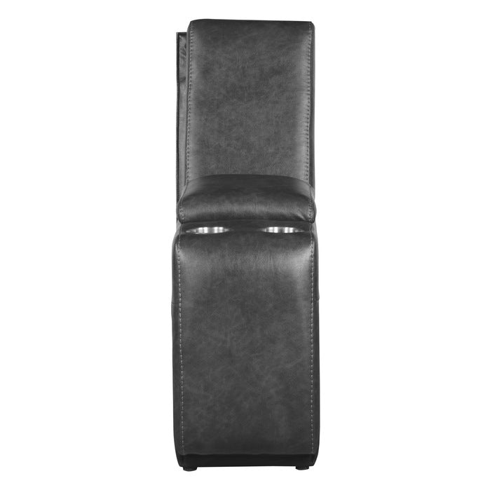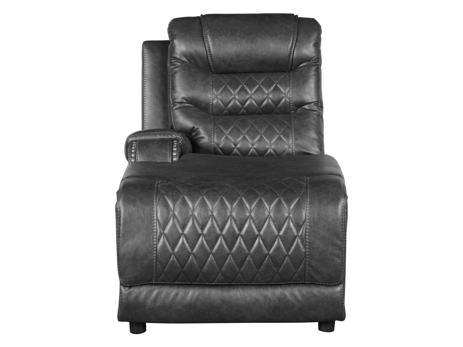 The Putnam Collection will serve as a functional, stylish, and comfortable seating group for your living room. Flanking the center corner unit are the left-side chaise and right-side reclining chair, featuring power reclining mechanisms and USB port, allowing for perfect placement within your available space and configurable to your individual needs. The console features cupholders and power receptacles. Expanding the profile of the sofa are the power recline armless chair and manual recline armless chair. The Putnam Collection is offered in gray polished microfiber fabric with diamond pattern stitching with nailhead-adorned arms for classic decorative effect.