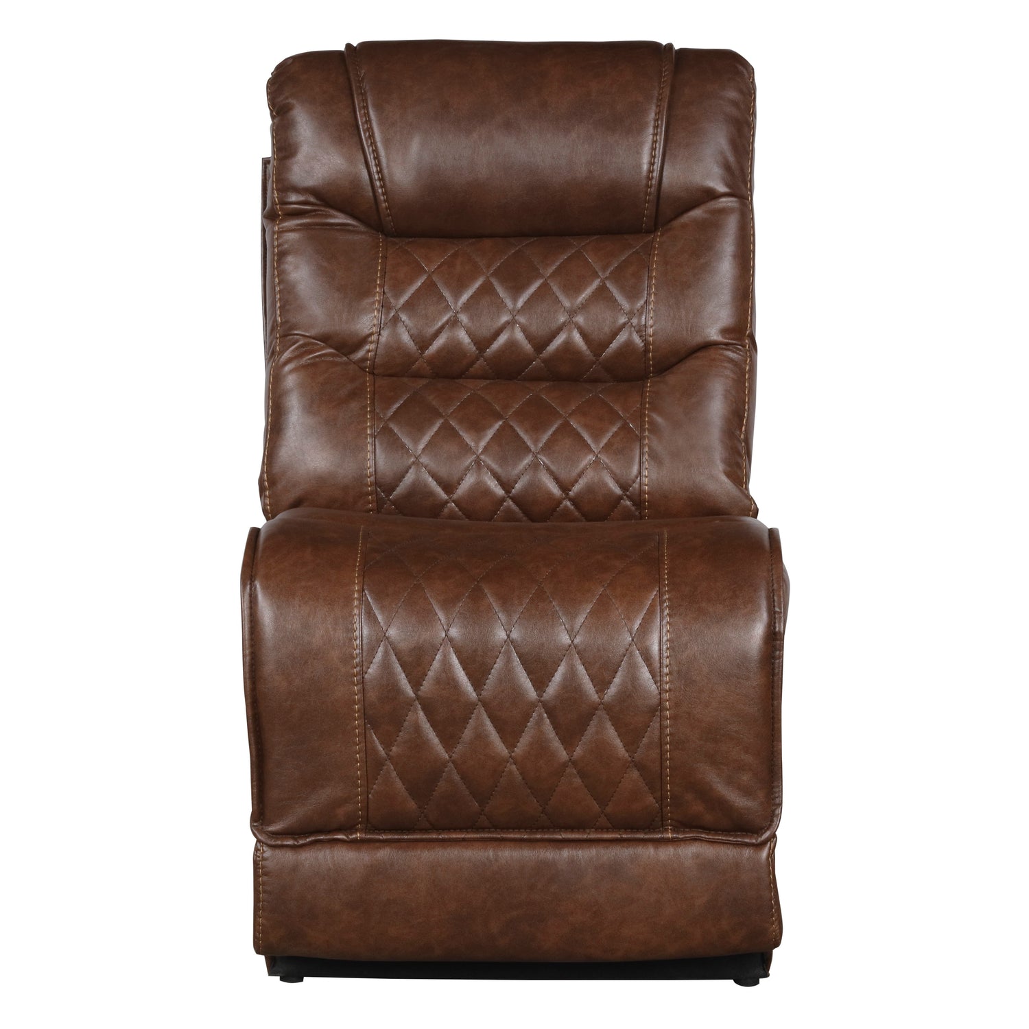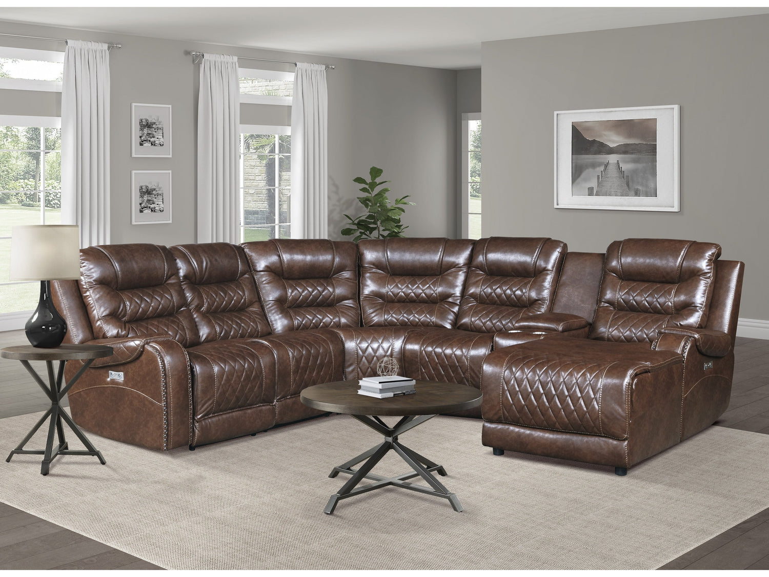The Putnam Collection will serve as a functional, stylish, and comfortable seating group for your living room. Flanking the center corner unit are the left-side chaise and right-side reclining chair, featuring power reclining mechanisms and USB port, allowing for perfect placement within your available space and configurable to your individual needs. The console features cupholders and power receptacles. Expanding the profile of the sofa are the power recline armless chair and manual recline armless chair. The Putnam Collection is offered in brown polished microfiber fabric with diamond pattern stitching with nailhead-adorned arms for classic decorative effect.