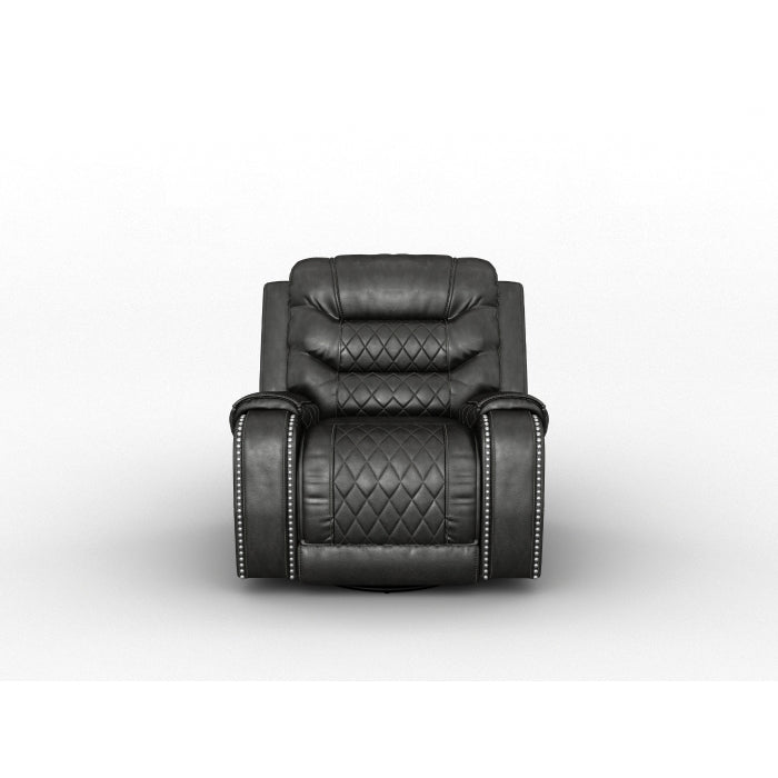 The Putnam Collection will serve as a functional, stylish, and comfortable seating group for your living room. The swivel glider chair features manual reclining mechanisms allowing for perfect placement and function within your available space. The Putnam Collection is offered in brown breathable faux leather upholstery with diamond pattern stitching with nailhead-adorned arms for classic decorative effect.