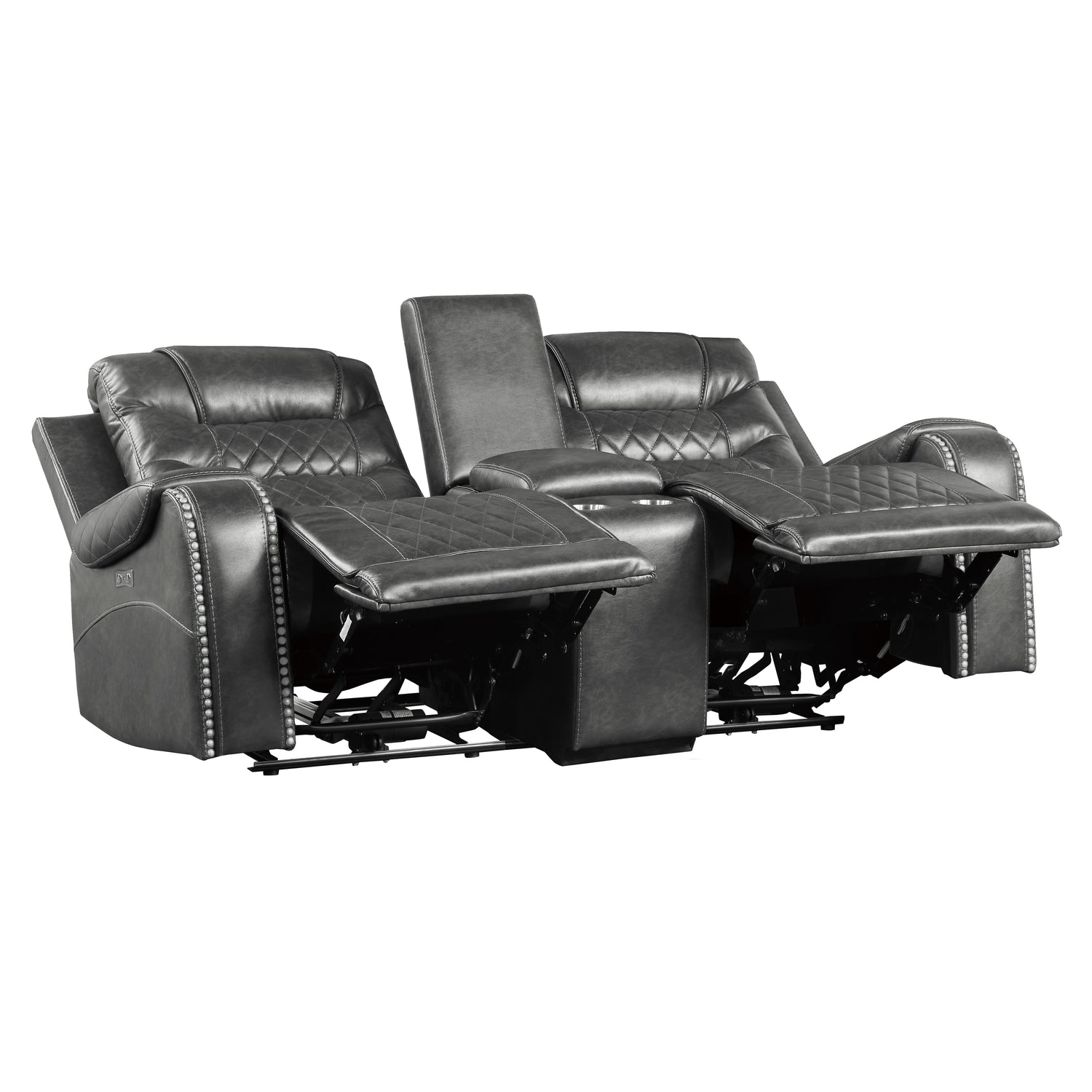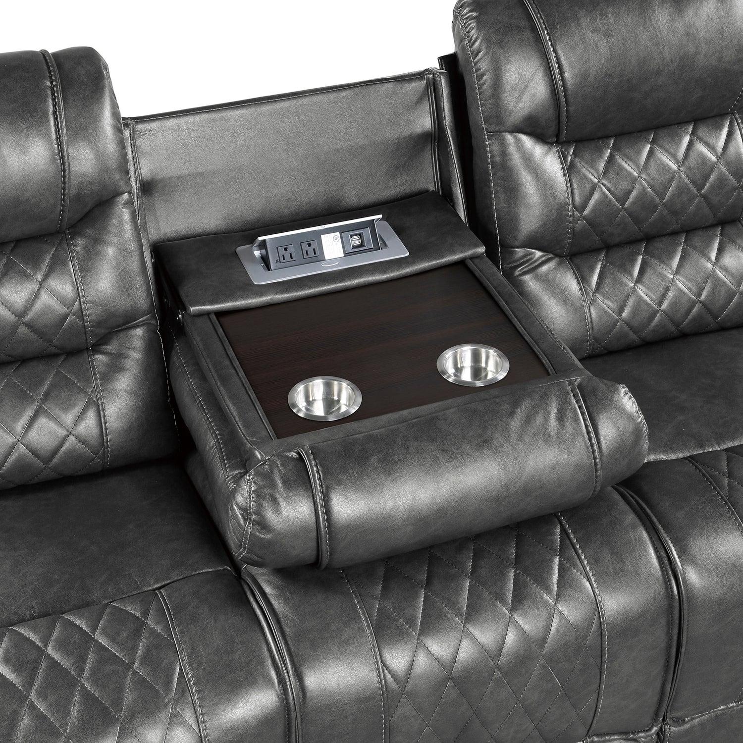 The Putnam Collection will serve as a functional, stylish, and comfortable seating group for your living room. The available sofa, love seat and chair, feature power reclining mechanisms and USB port, allowing for perfect placement within your available space. The love seat's console and the sofa's drop-down center seatback table feature cupholders and power receptacles. Expanding the options of the collection is the power reclining chair. The Putnam Collection is offered in gray breathable faux leather upholstery with diamond pattern stitching with nailhead-adorned arms for classic decorative effect.