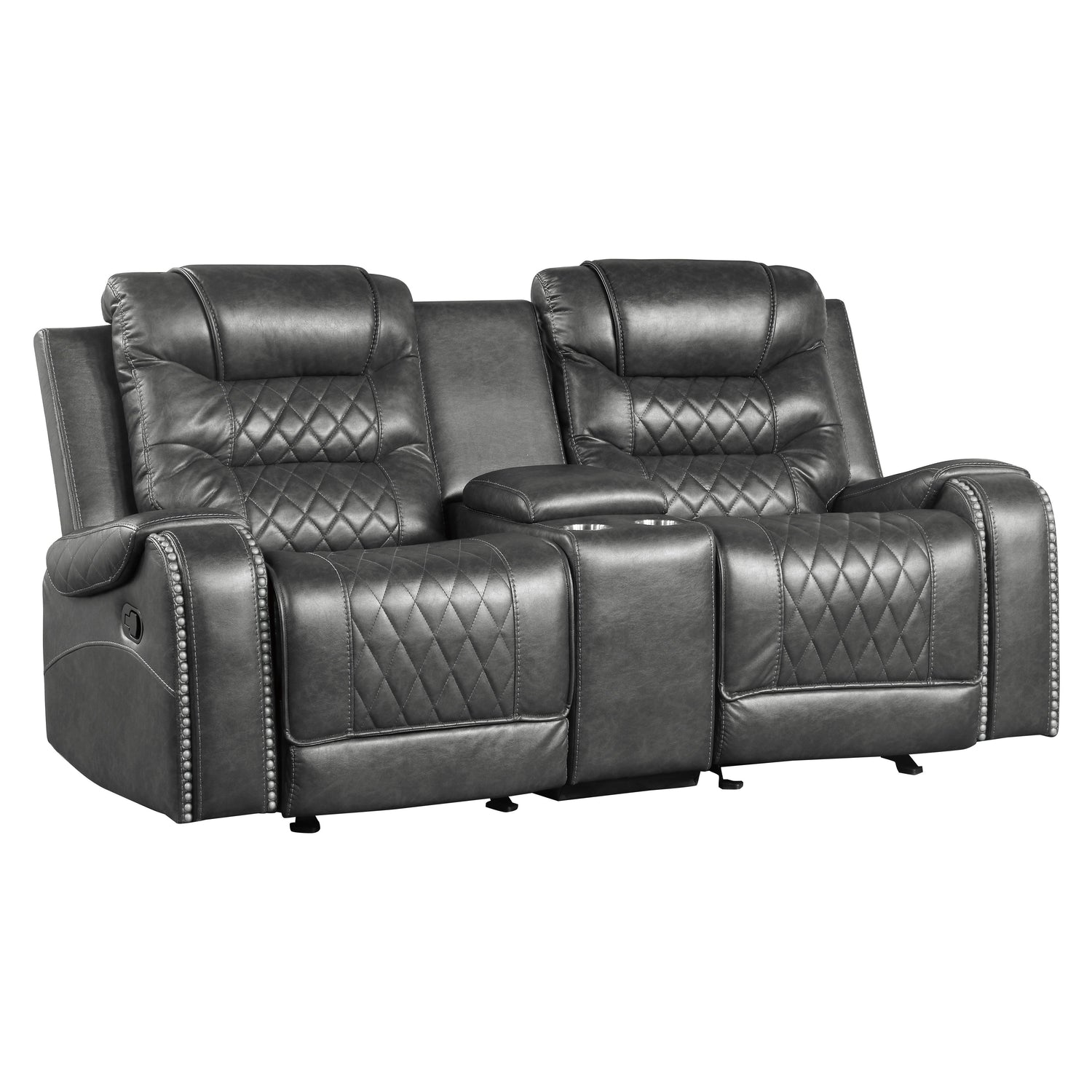 The Putnam Collection will serve as a functional, stylish, and comfortable seating group for your living room. The love seat features dual end manual reclining mechanisms and USB charging port, allowing for perfect placement within your available space. The love seat’s center console features cupholders and power receptacles. The Putnam Collection is offered in gray breathable faux leather upholstery with diamond pattern stitching with nailhead-adorned arms for classic decorative effect.