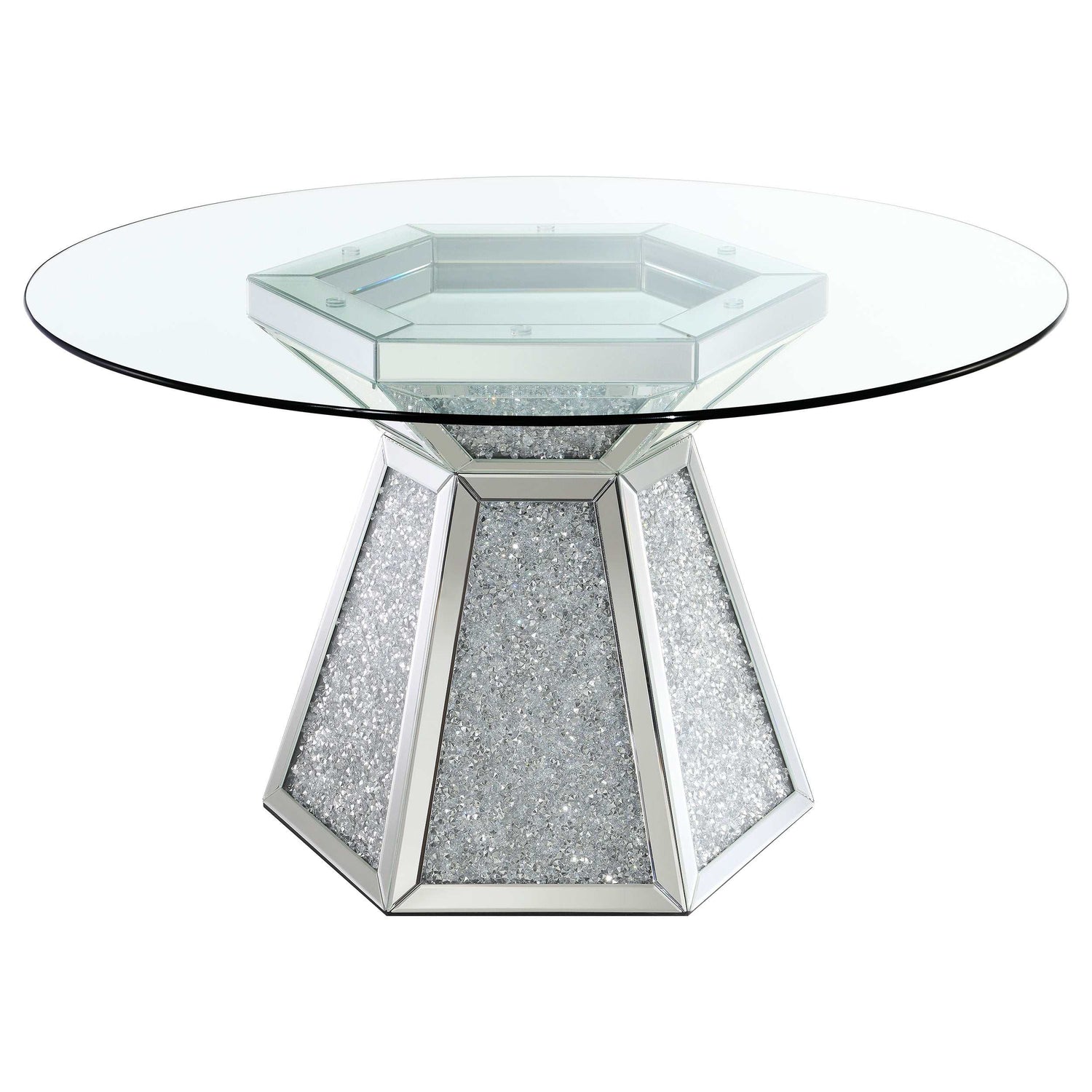 Host a small gathering in your dining room with this modern glam dining table set, consisting of a spacious, round dining table and four side chairs. A clear glass tabletop creates breathability and shows off the stunning faux diamond inlay of the hourglass-shaped pedestal base. Created in a hexagonal profile, the pedestal base is lined with mirror tile along the outer edges, offering a sleek and sophisticated flair. Surround the table with the four velvet upholstered side chairs, featuring channel tufted rolled backs that give off a classically designed aesthetic. Lustrous stainless steel flared legs reflect the mirror accents, offering a cool tone metallic touch.
