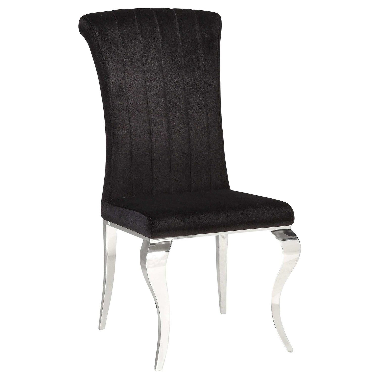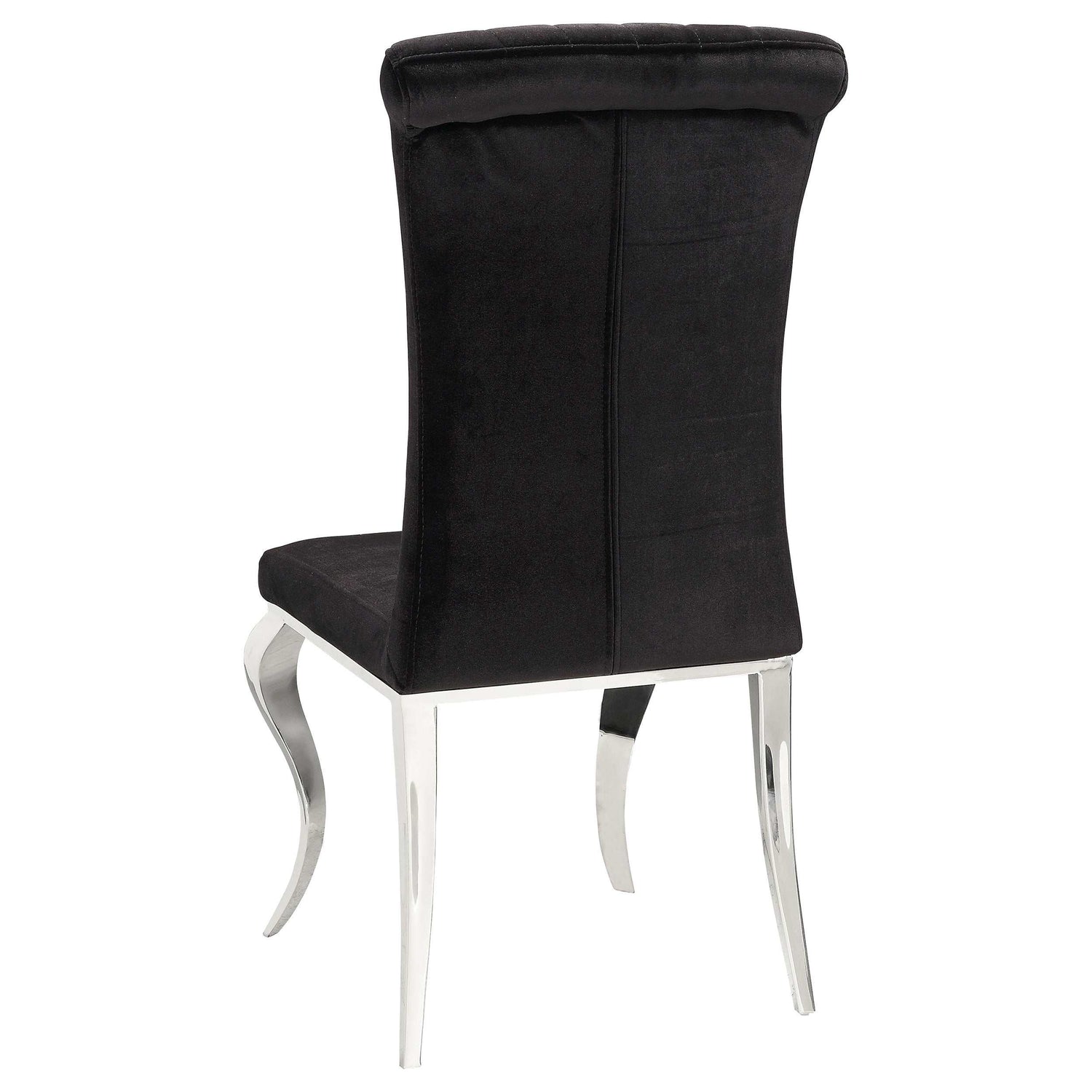 Channel tufted rolled backrests on the dining chairs present a timeless aesthetic