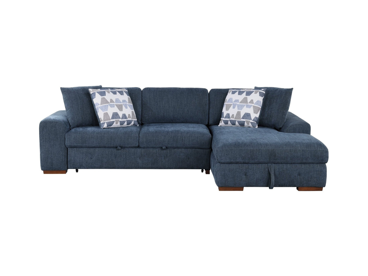The substantial seating space of the Raife Collection creates a comfortable spot perfect for entertaining or just relaxing. The configuration consists of a right-side chaise which is paired with a left-side two-seater – with pull out bed and one centimeter of memory foam on the seats. The pull-out bed that is stored beneath the left-side two-seat unit, pops up to create ample space for full leg extension. The lift-top seat of the chaises opens to reveal hidden storage perfect for blankets and pillows. Blue chenille fabric upholstery covers the seating group.