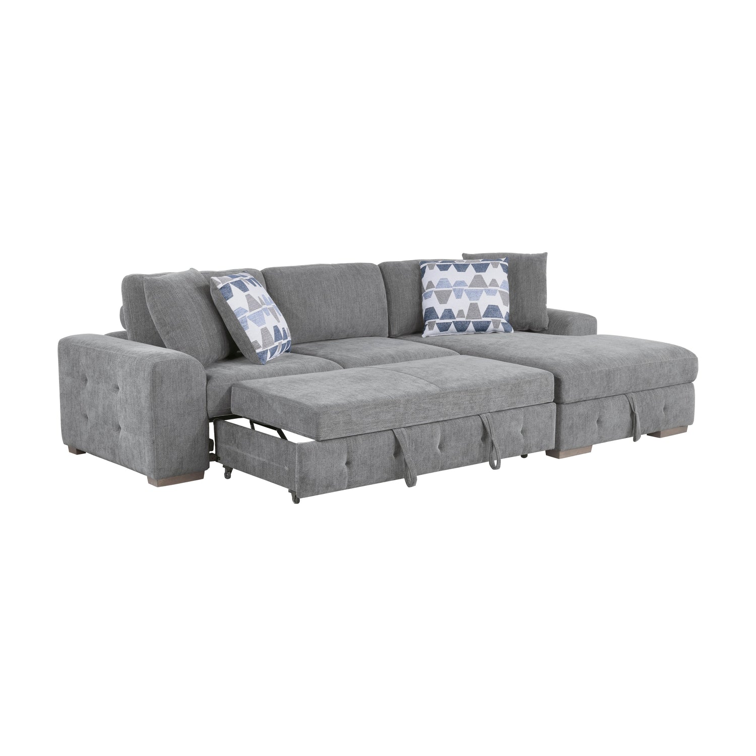 The substantial seating space of the Raife Collection creates a comfortable spot perfect for entertaining or just relaxing. The configuration consists of a right-side chaise which is paired with a left-side two-seater – with pull out bed and one centimeter of memory foam on the seats. The pull-out bed that is stored beneath the left-side two-seat unit, pops up to create ample space for full leg extension. The lift-top seat of the chaise and storage ottoman each open to reveal hidden storage perfect for blankets and pillows. Gray chenille fabric upholstery covers the seating group.