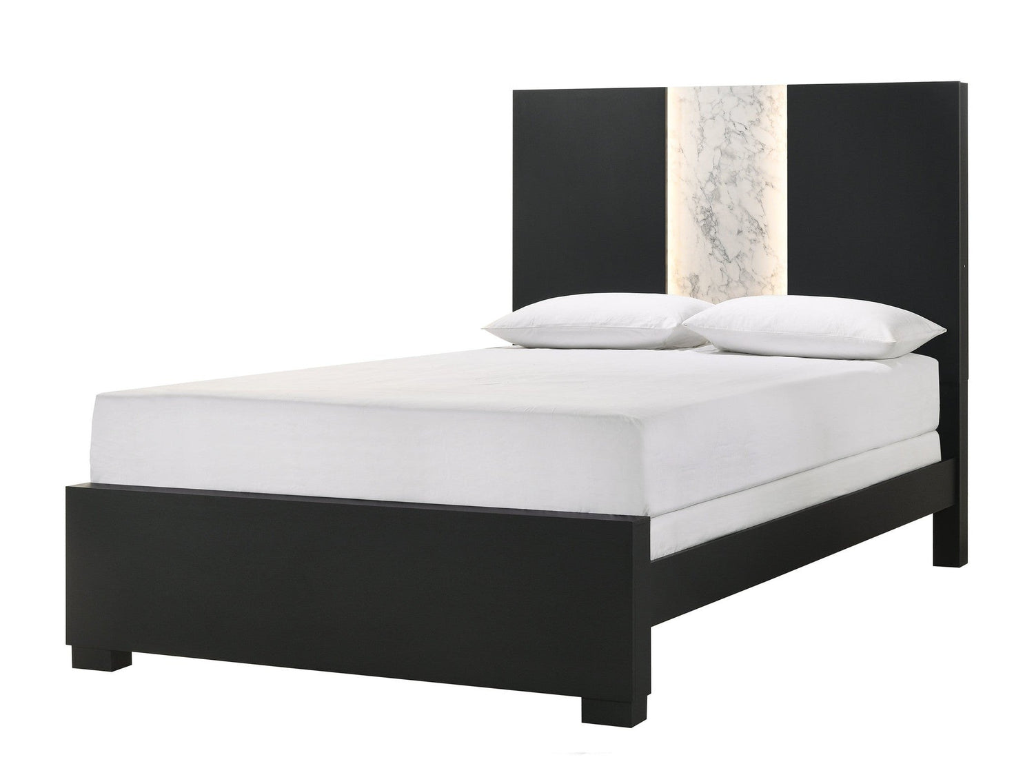 - Color: Black, with a headboard featuring a central panel with a white and grey marble-like pattern and warm yellow integrated light strips.
