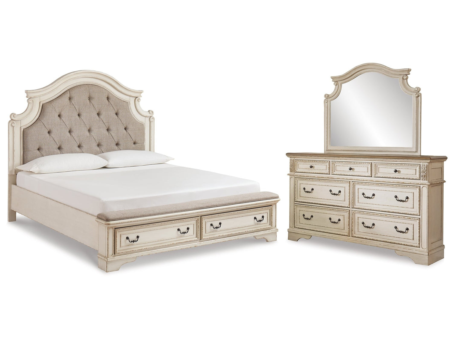 - Item Name: Realyn Chipped White King Upholstered Bed with Dresser and Mirror