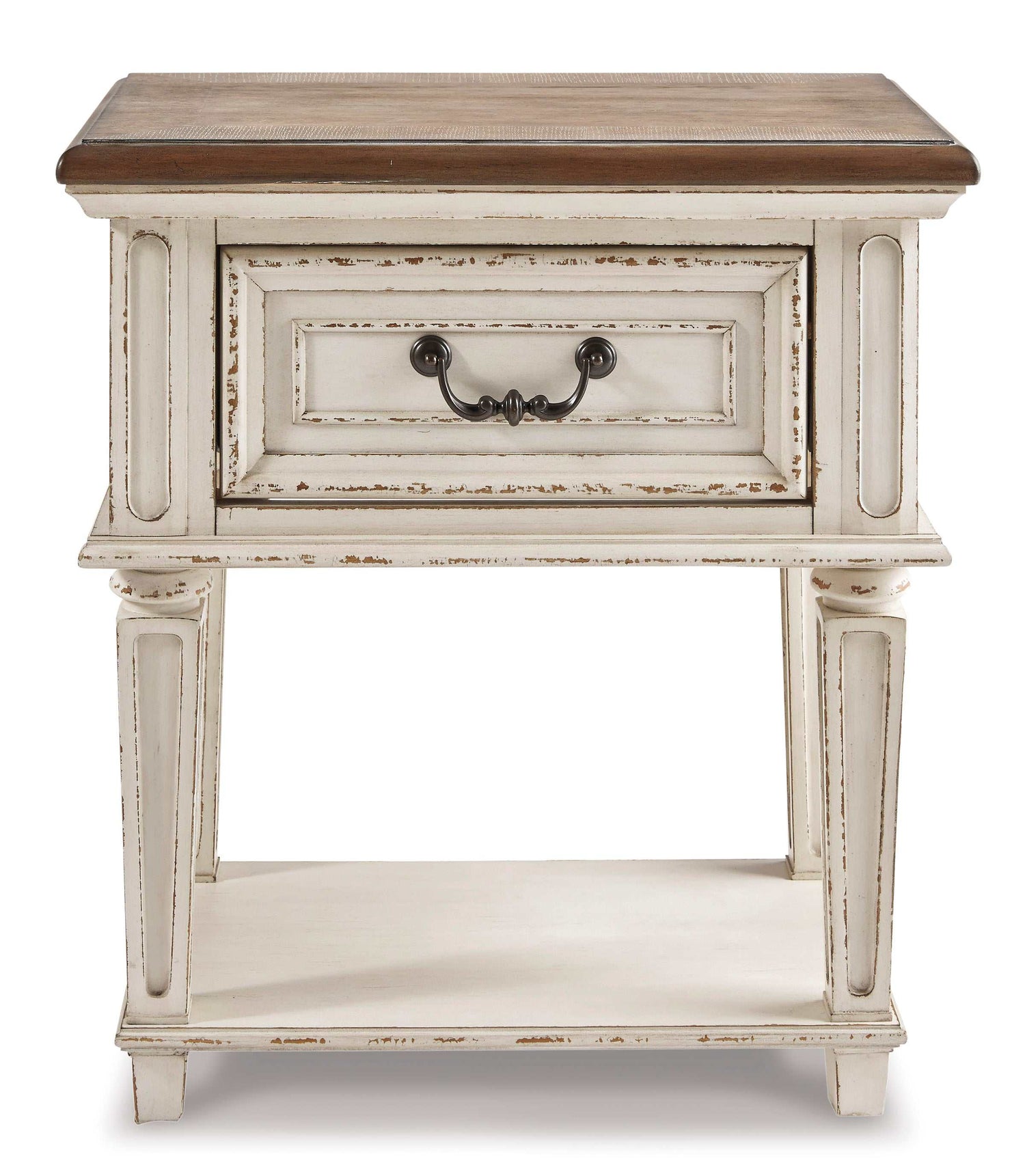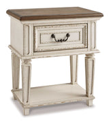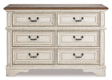 Elevating the art of traditional cottage styling, this bedroom set is your dream retreat realized. A sumptuous beauty, the upholstered bed wows with a distressed chipped white finish for heirloom appeal. The deep tufting on the cushioned upholstered headboard adds a cozy element that will surely put you at ease. Framed drawer fronts, decorative corbels, bail pulls, and contrasting wood-finished surfaces add to the charm.