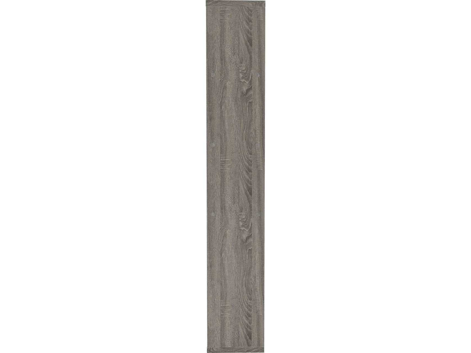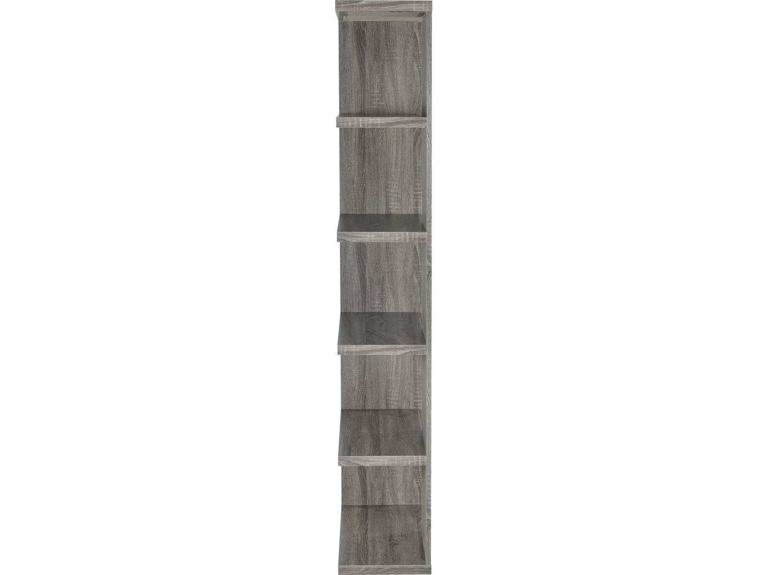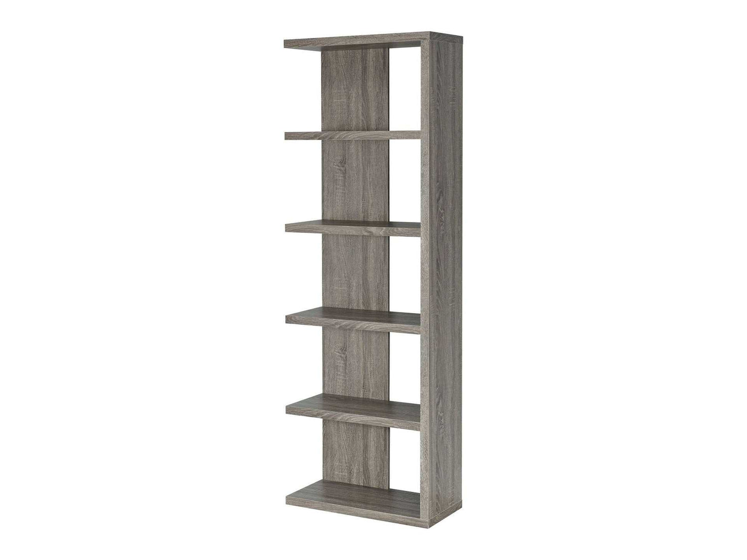 - Modern bookcase in weathered grey finish features interesting design with shelves open on one end