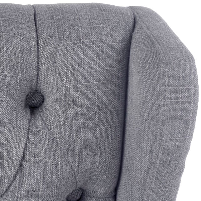 Classic charm and elegance adorn this luxurious, tufted dining chair. Wrapped with grey linen blend upholstery and a tan jute back, this armless dining chair features a classic wingback silhouette and a foam-filled seat for extra support. Diamond tufting and nailhead trim complete the tailored look and traditional feel. It also features four tapered rubberwood legs in an antique wood finish.