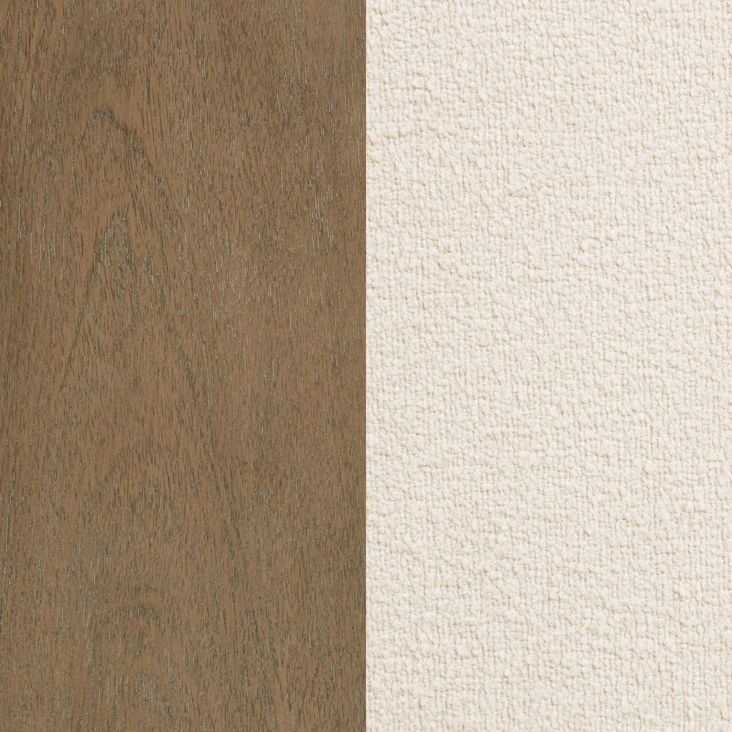 - Cushioned seat upholstered in soft ecru fabric for comfort and style
