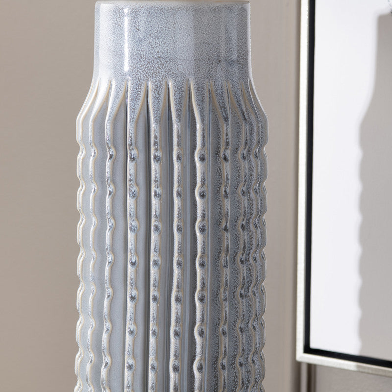- Vertical ribbed body offers sculptural texture and depth