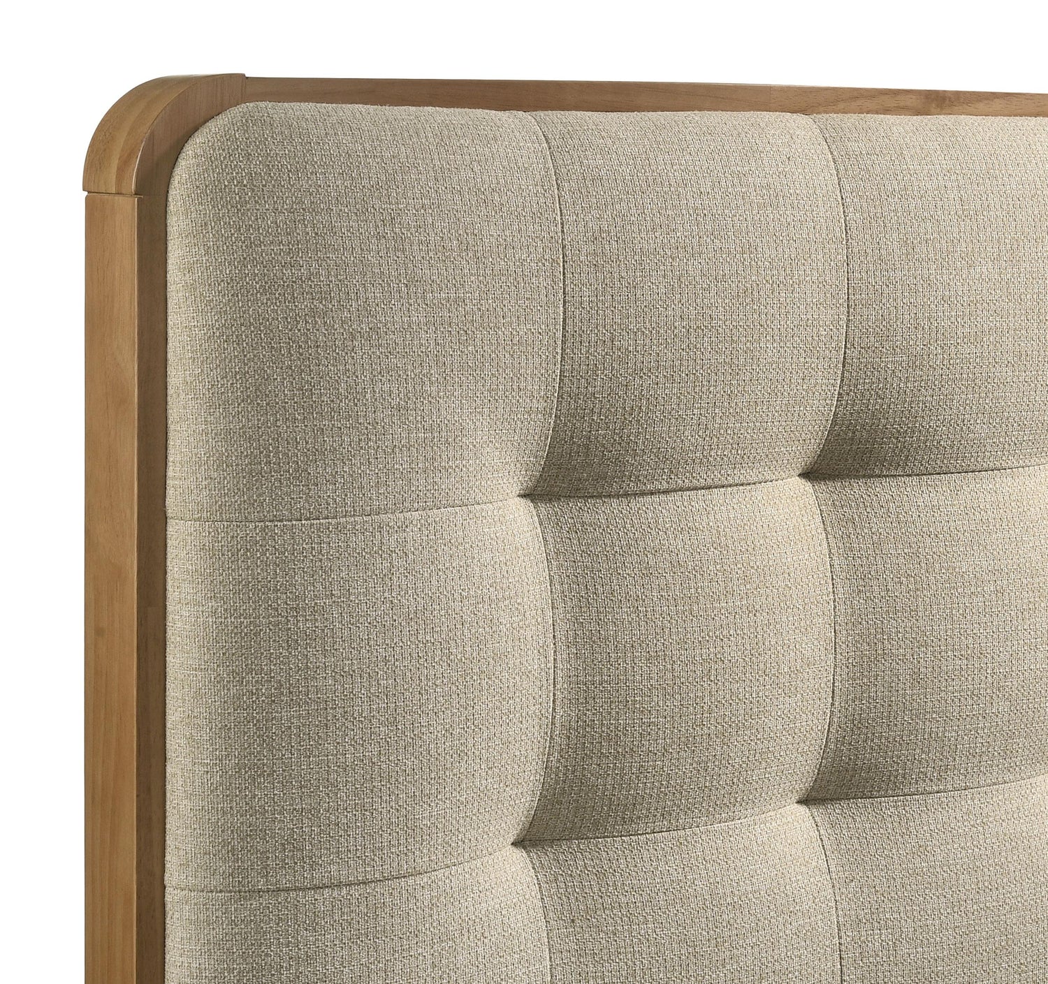- Cool beige fabric upholstered headboard with thick padding and square tufting
