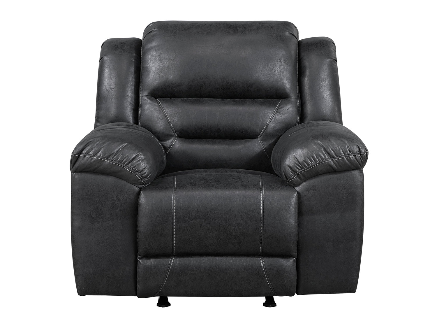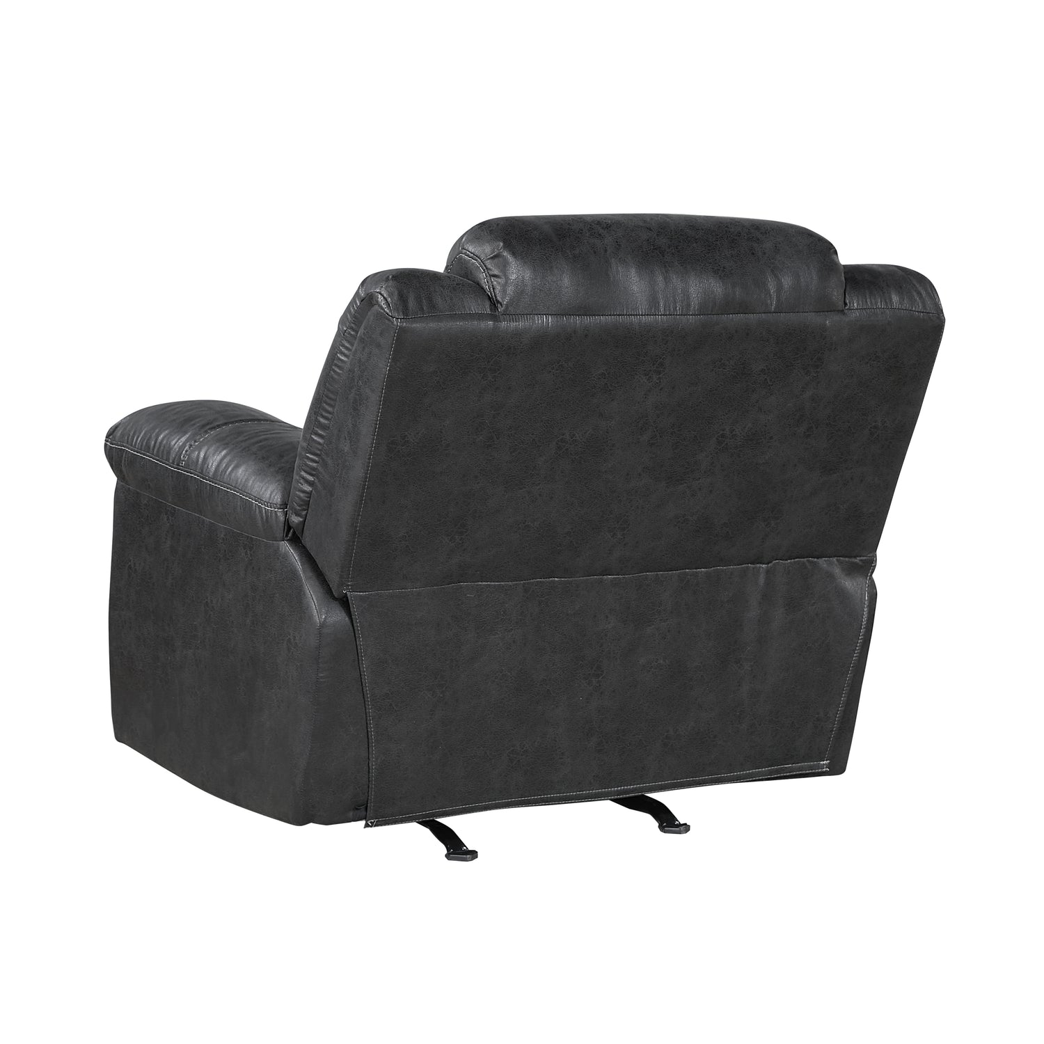 The Hazen Collection’s versatile style and functional design will be an inviting addition to your home’s living room. The reclining chair provides a spot for your relaxation, extending your comfort with a gentle rocking motion. The reclining mechanism is engaged with a pull of the side mounted tab, taking you from seated to prone in an easy motion. Black polished microfiber upholstery covers the plush pillow-top arms and contoured seating, creating a perfect combination ready for relaxation.
