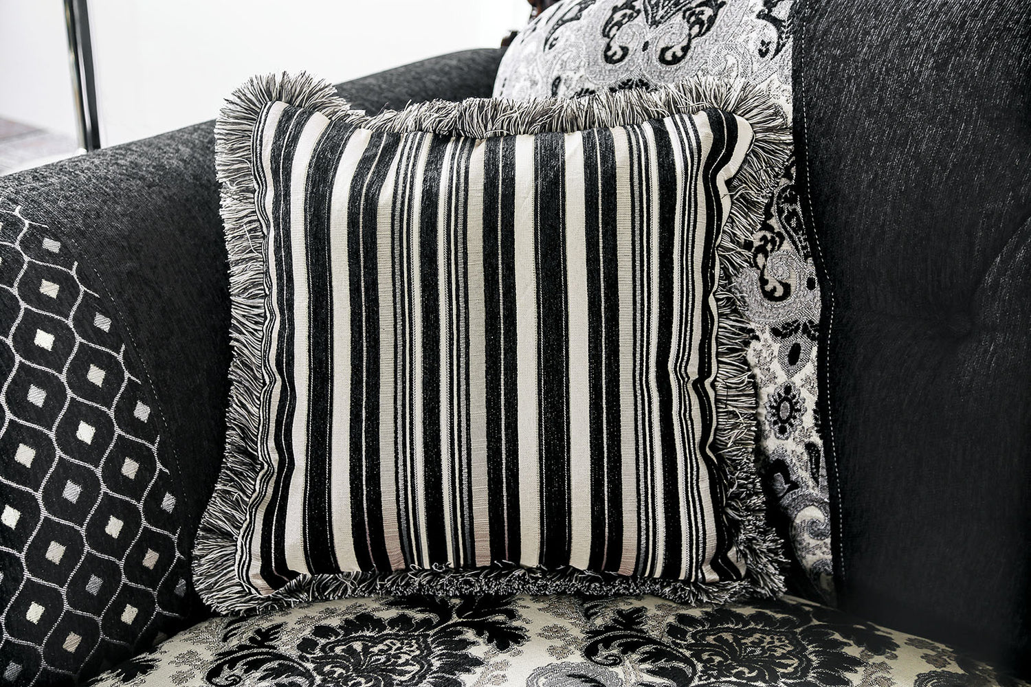 This salon-inspired sofa from the Ronja Collection will add sophistication to your living room. This sofa is one-of-a-kind, with a curvy design, button tufting, and dapper damask fabric on the reversible box cushions. Each plush cushion is encased in black welting, and the rolled arms feature wooden accents, creating an antique refinement perfect for the focal point of your living room.