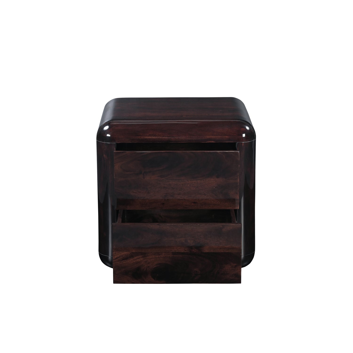 - A high-gloss nightstand with rounded corners that add softness to its boxy shape