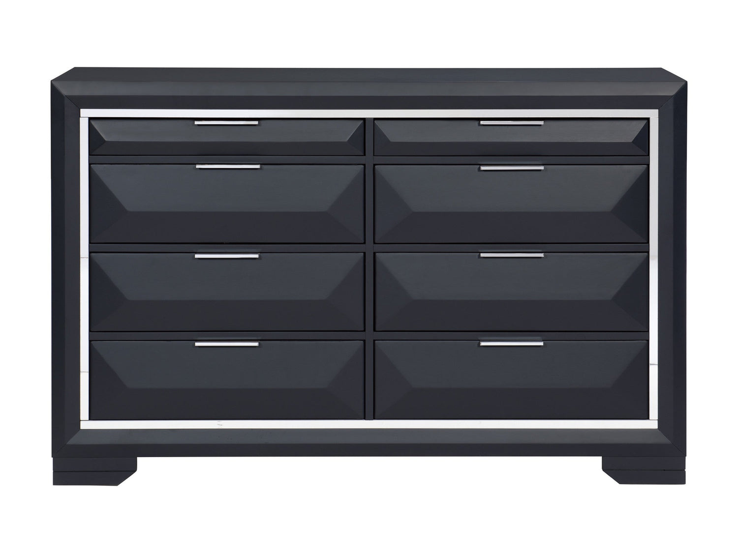 The modern design of the Rosemont Collection creates a striking profile for your bedroom. The midnight blue finish is reflected by the chrome banding that defines the front of the dresser. Chrome pull hardware accents each of the raised drawer fronts.
