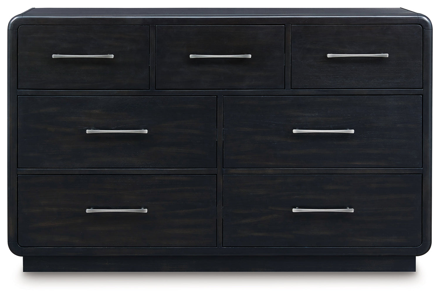 Inspired by art deco design, this softly shaped dresser makes a lasting impression in a simply stunning way. Its magnificent curved silhouette is enhanced by a rich layered black finish on the textured wood grain surface. This is the statement piece you’ve been dreaming of to elevate your contemporary inner sanctum.