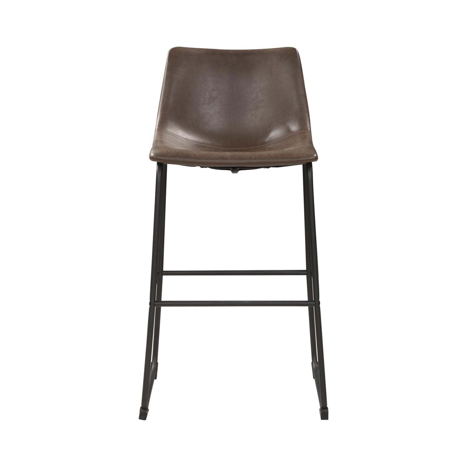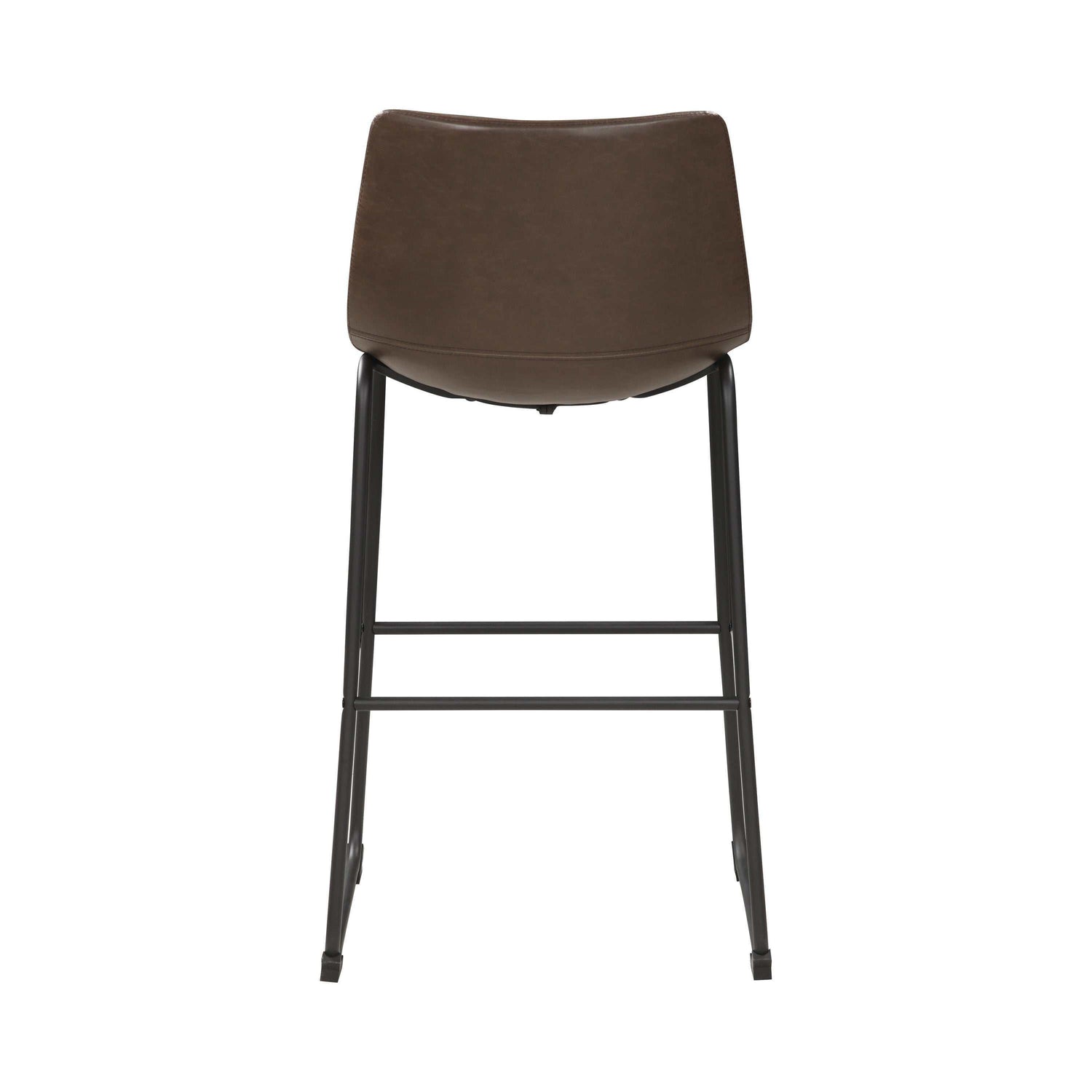 - Bucket style bar stool upholstered in two-tone brown leatherette with metal base in black finish