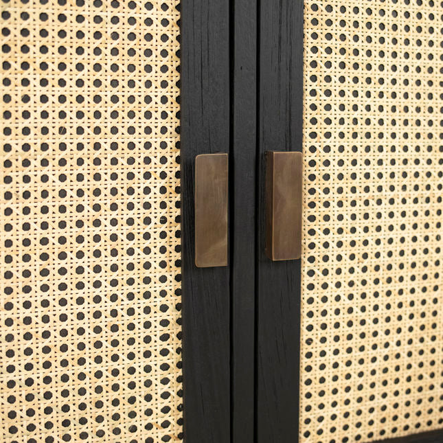 This 42' sideboard was perfectly designed to refresh your decor with modern coastal flair. Its rich black hardwood frame is beautifully offset by the natural woven rattan panel details of its double doors. Featuring ample storage and two interior fixed shelves that can accommodate dinnerware, electronics, or office supplies.