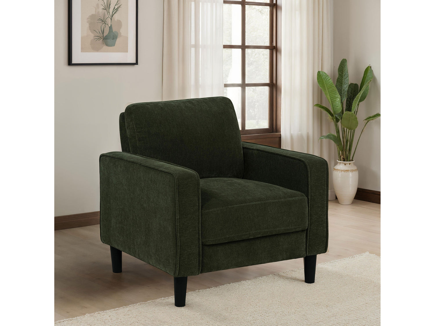 The Ruth Matcha Green Fabric Upholstered Track Arm Accent Chair is an accent chair constructed from fabric, foam, and plastic that provides modern simplicity with soft comfort. Framed by slim track arms, this chair features plush foam cushions for lasting support. Its well-defined upholstery adds understated texture, bringing quiet structure to any contemporary room.